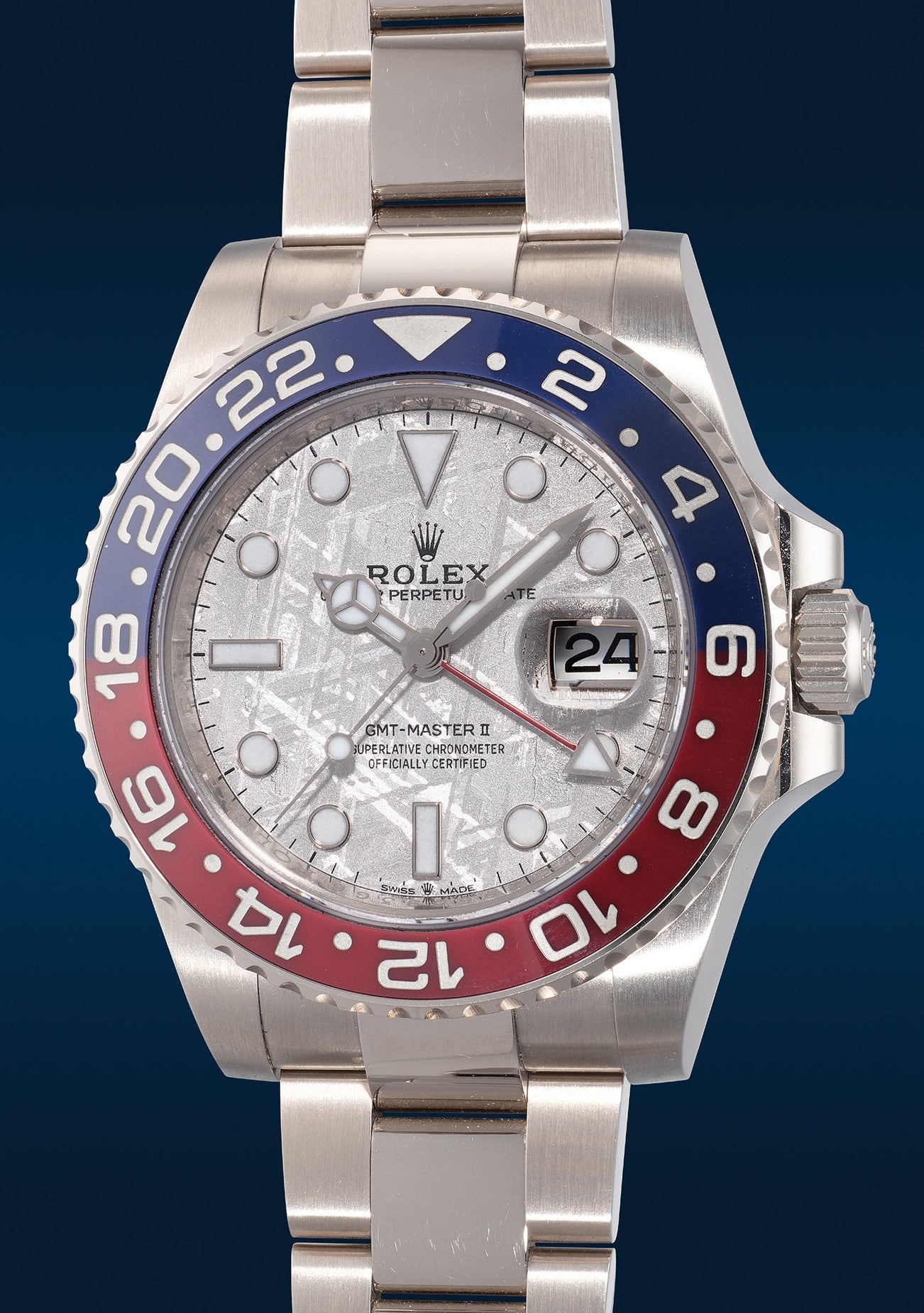 勞力士,「GMT-Master II」型號126719BLRO,精細,白金自動兩地時區鏈帶腕錶,備天然隕石錶盤、中心秒針、日 期顯示,約2022年製。附原裝證書、配件、錶盒