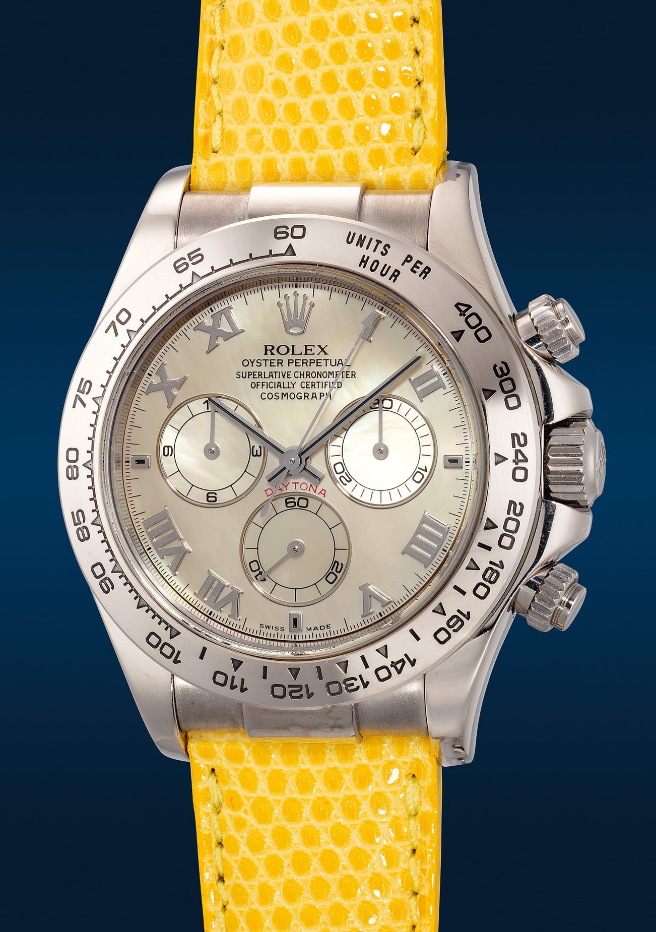 The present ref. 116519 offered here with a "P" serial number encapsulates a pristine yellow mother-of-pearl dial Daytona “Beach”, representing one of the very first sold following the editions' 2000 launch. For collectors, this exceptionally well-preserved example represents a rare opportunity to acquire one of the avant-garde chronographs that has already stood the test of time and been rightfully regarded as an icon.