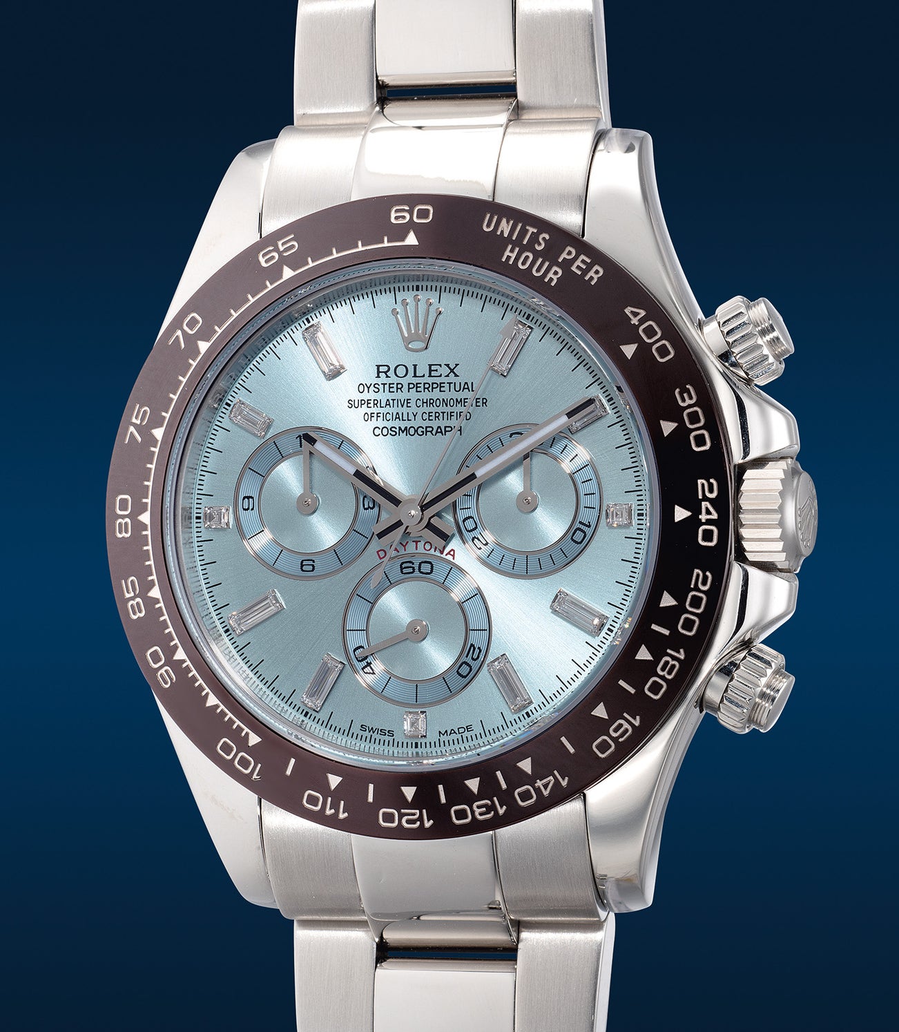 勞力士,「Cosmograph Daytona」型號116506,十分精細罕有,鉑金自動計時鏈帶腕錶,備冰藍色錶盤、方鑽時標、棕色陶瓷錶圈,約2017年製。附原裝證書、錶盒、配件