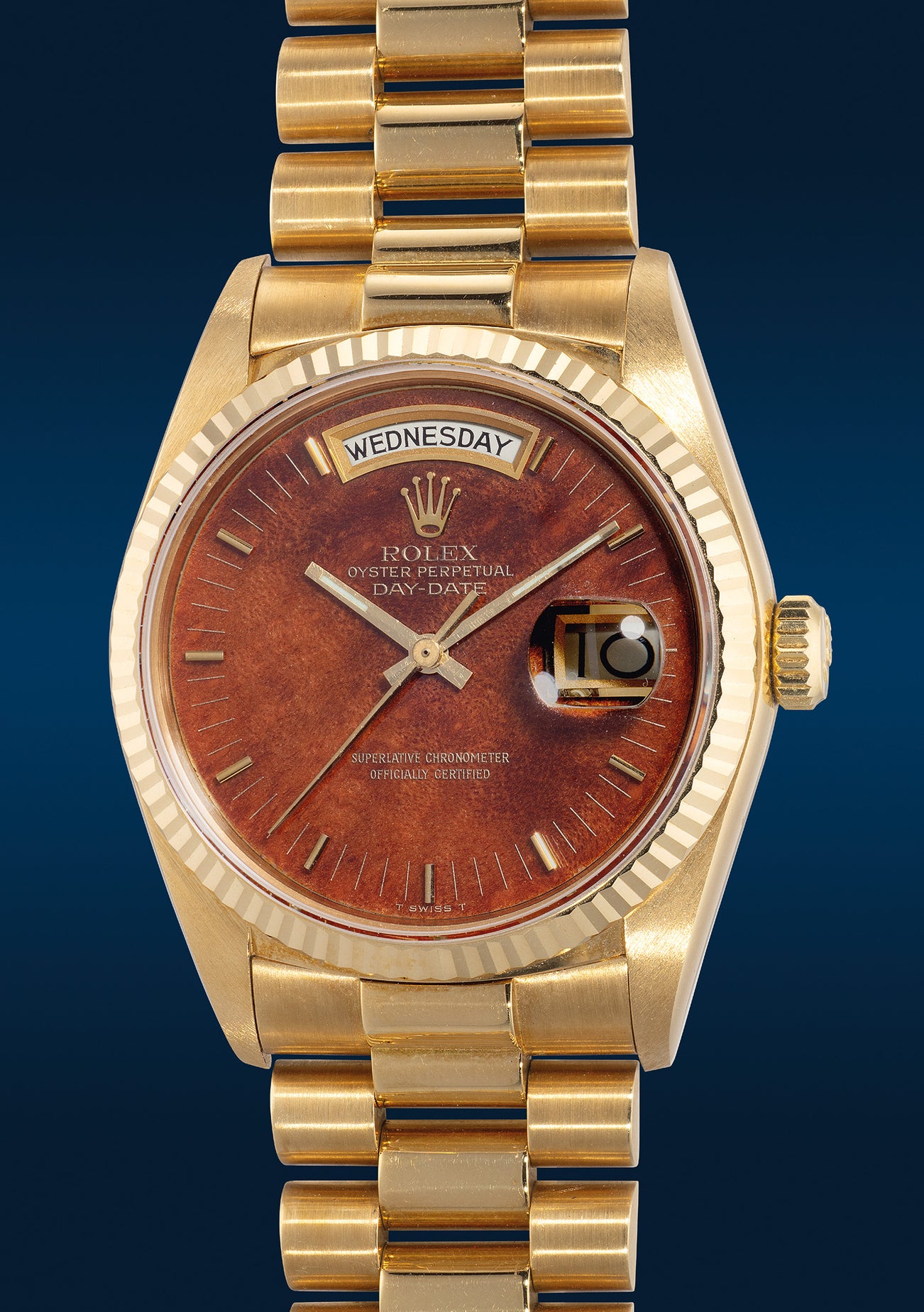 Available in a variety of dial options, including Stella dials, hard stone dials, and metal dials with various designs, the reference 18038 also showcased the creative prowess of Rolex by featuring wooden dials, as seen in the present example. The incorporation of organic wooden dials brings a refreshing aesthetic to the wristwatch, juxtaposing the technical nature of the timepiece with the natural allure of the wood's unique grain patterns. Each wooden dial is inherently one-of-a-kind, ensuring that no two dials will ever possess the exact same appearance.