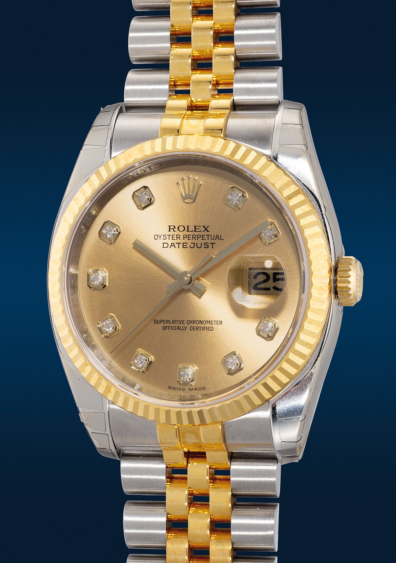 Offered in "new-old-stock" condition, the present Rolex Datejust features a classic two-tone stainless steel and yellow gold 36mm case, combining the durability of stainless steel with the elegance of yellow gold. The watch is adorned with a champagne-hued dial, complemented by yellow gold hands that match the case. To add further allure, the dial is embellished with 10 brilliantly-cut diamonds, enhancing the overall appeal of this iconic timepiece.