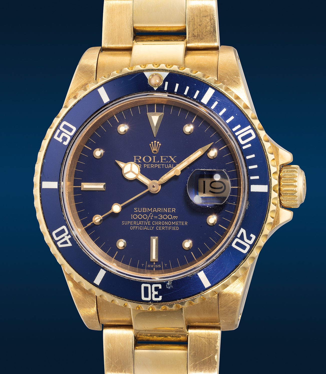 The present watch is a beautifully preserved example with an unusual and special matte blue dial. Positioned between the standard black matte dial and the blue radial dial, this highly sought-after "nipple dial" is believed to be one of the experimental test dials that Rolex used to explore variations in their catalog. Despite over 40 years of age, the dial has aged beautifully and is very well-preserved, maintaining its excellent overall condition. Furthermore, the watch is accompanied by its original guarantee. With its unique and rare dial, this early gold Submariner ref. 16808 is sure to attract attention as one of the most appealing and distinctive examples available in the market.