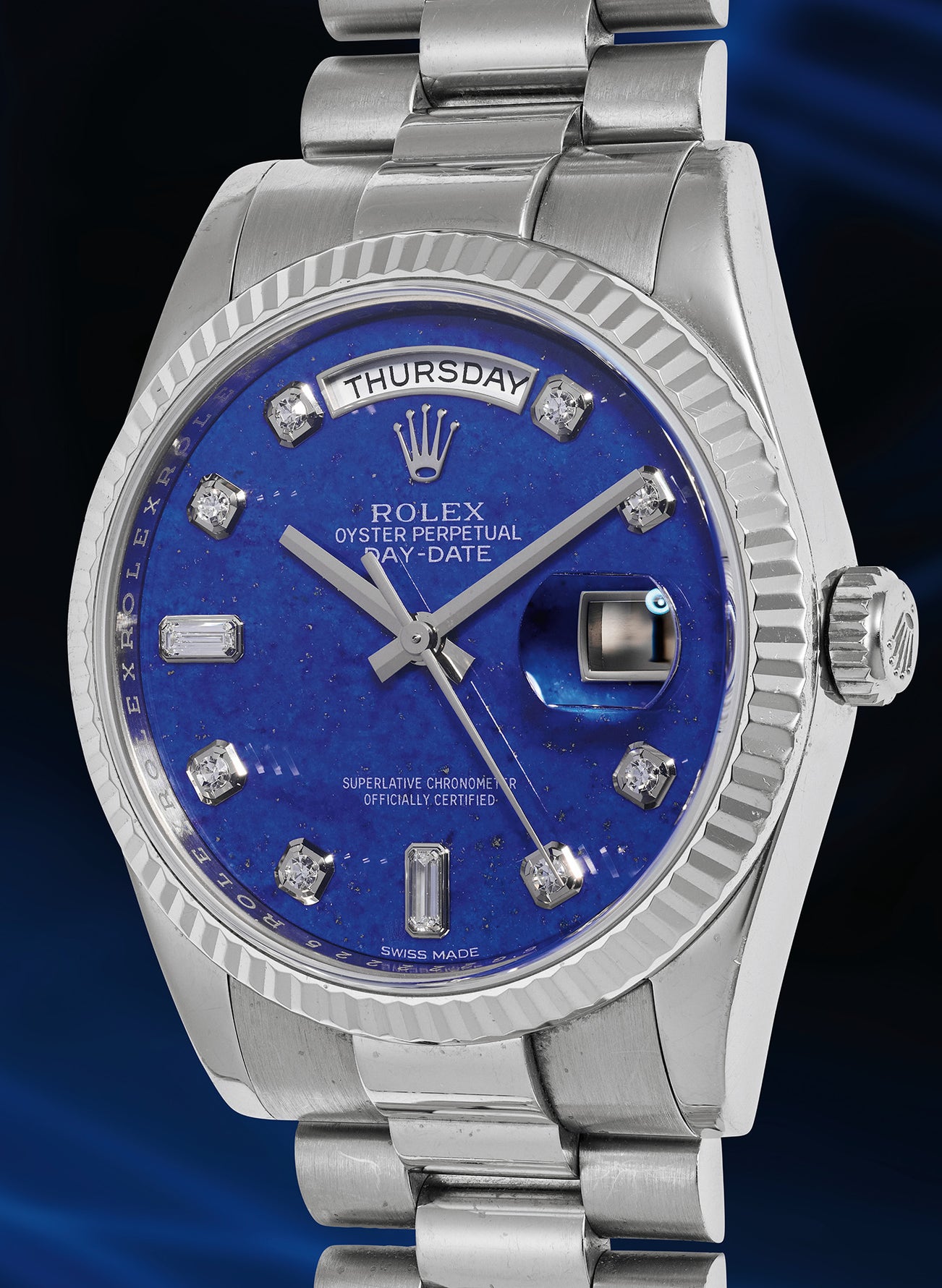 勞力士,罕有,白金鑲鑽鏈帶腕錶,備青金石錶盤、日期、星期顯示。附保證書及錶盒