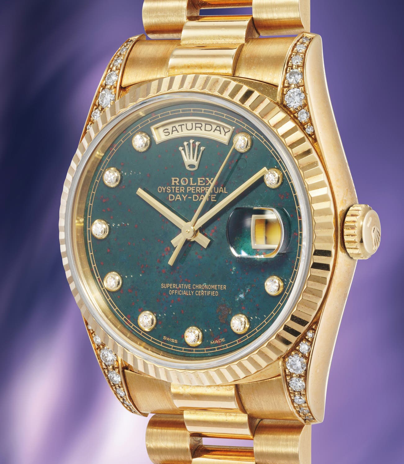 The Day-Date has only ever been cased in precious metals, attesting to its glamour and prestige. The present reference 18338 (with the reference number corresponding to the diamonds on the top of the lugs) features an incredibly rare and charismatic bloodstone dial, defined by its forest green hue and subtle copper flecks throughout. The material provides a striking contrast with the warm gold case and round diamond markers, creating a powerful aesthetic effect.