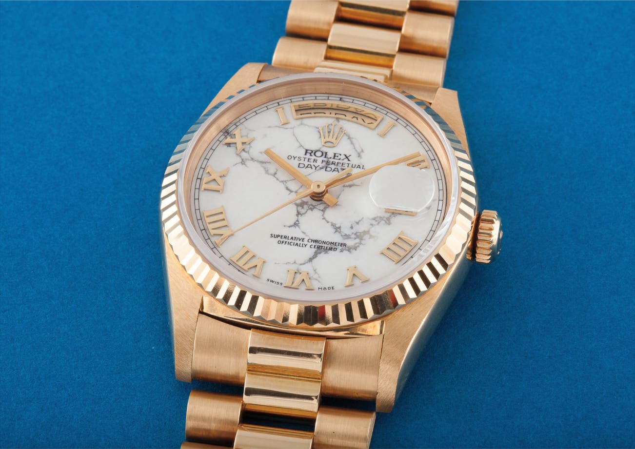 A very rare and unusual yellow gold automatic calendar wristwatch with centre seconds, bracelet and marble hard stone dial