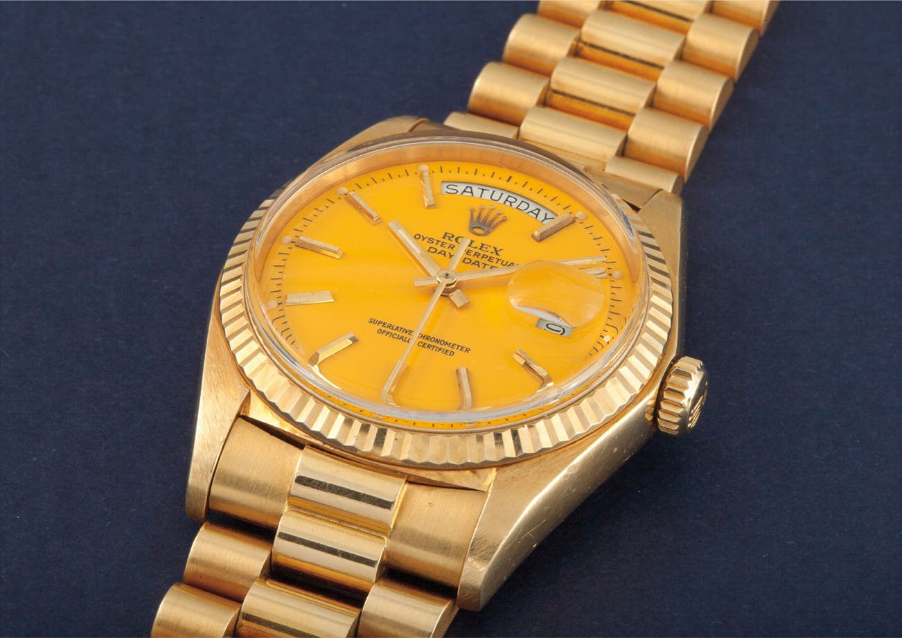 The denomination “Lacquered Stella” was given by Rolex and matched to the coloured versions of enamel dials sported by Day-Date models. These dials were produced in small numbers out of catalogue and were made available when requested from retailers. Amongst all colors, the present yellow would appear to be the rarest.