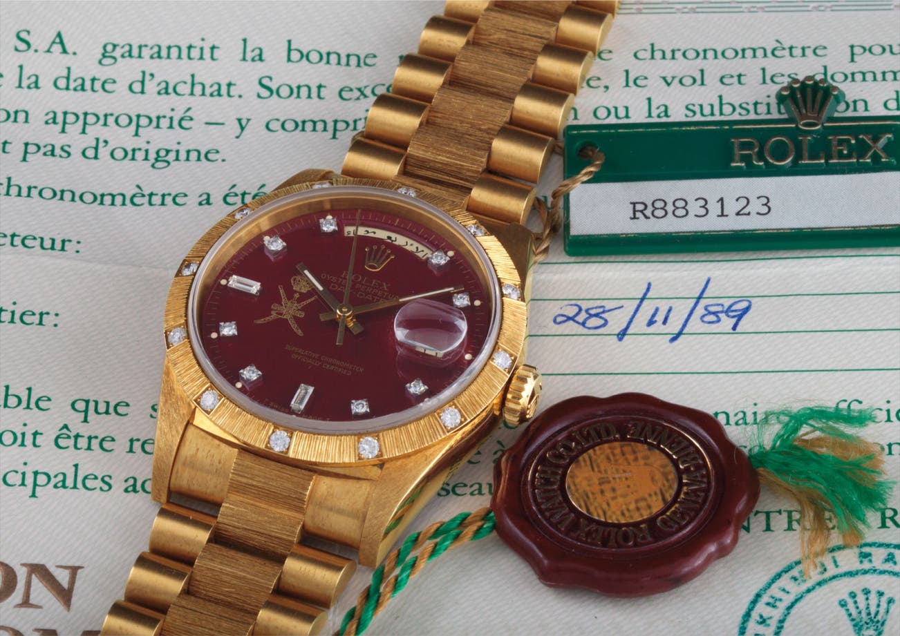 A very rare and possibly unique yellow gold and diamond-set wristwatch with Arabic calendar, bracelet, centre seconds, burgundy lacquered “Stella” dial, original guarantee, swing tags, made for the Sultanate of Oman