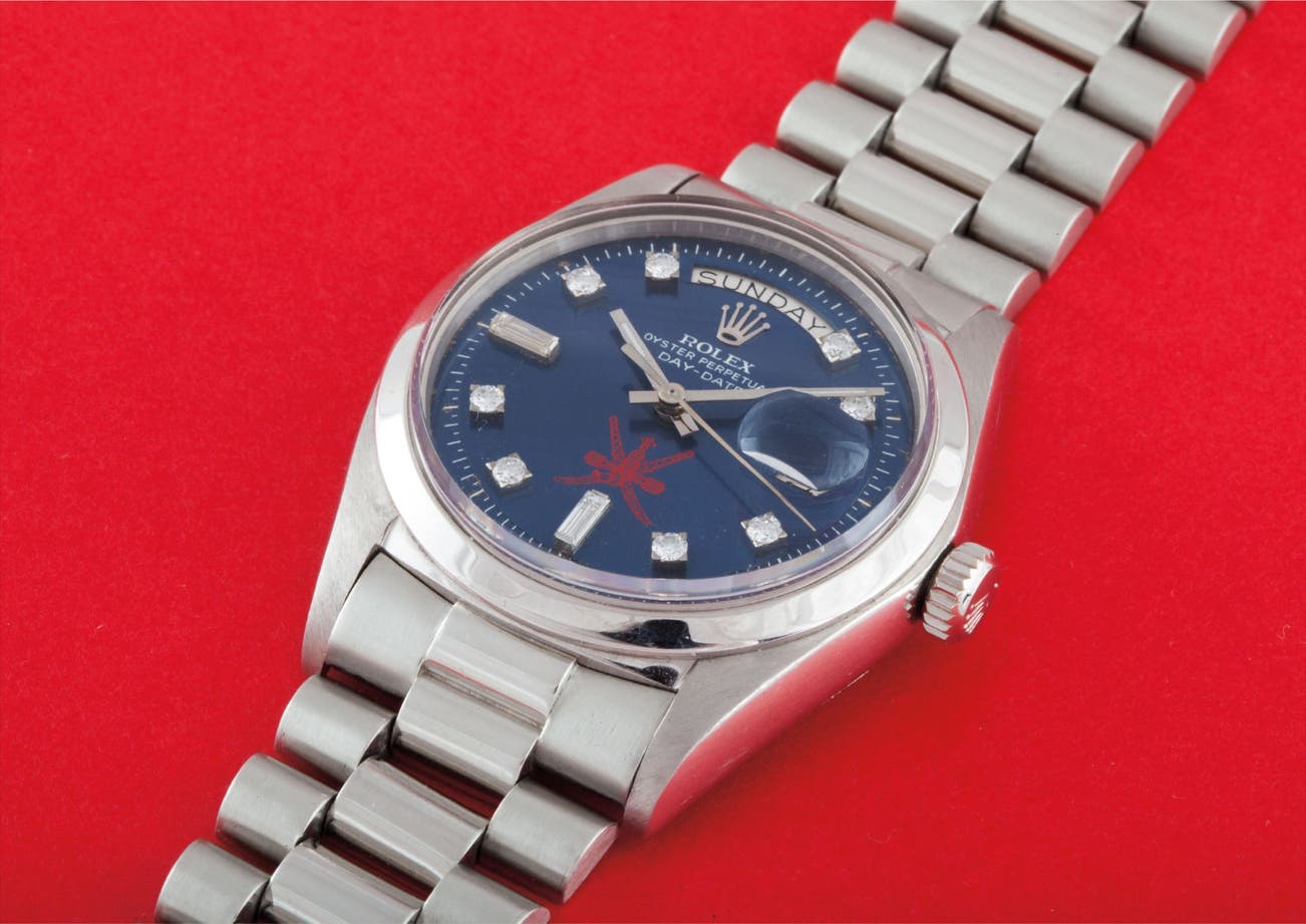 The case back of this extraordinary timepiece features the engraved signature of the London jeweller Asprey, which at the time was Rolex’s Middle East distributor of personalized Rolex watches destined to Oman.