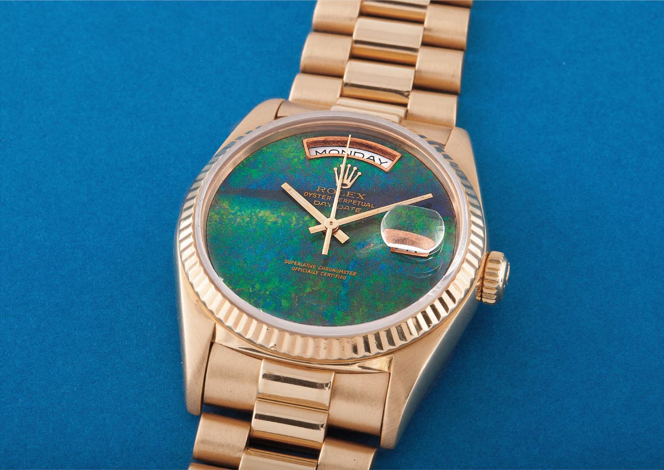 A very rare and unusual yellow gold calendar wristwatch with centre seconds, bracelet and opal hard stone dial