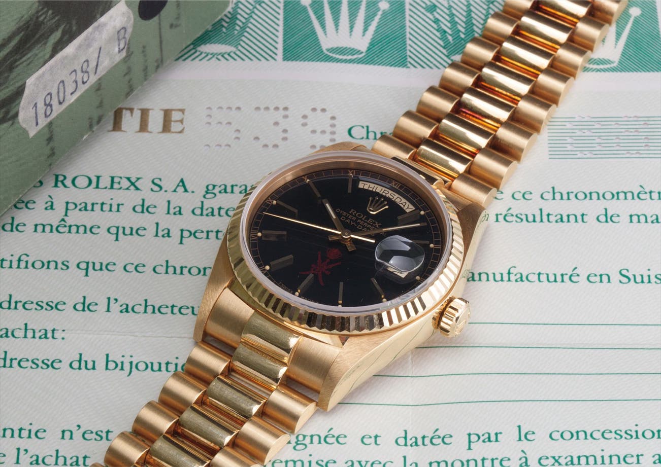 A very rare yellow gold calendar wristwatch with bracelet, centre seconds, black lacquered dial, guarantee and box, made for the Sultanate of Oman