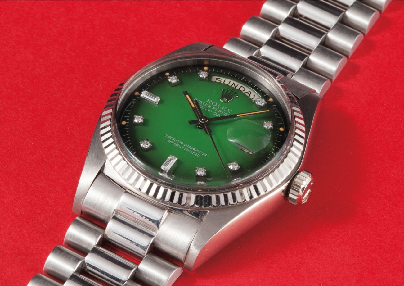 Beyond its extremely rare white gold case, this timepiece features a dégradé green dial adorned with 8 round cut diamond indexes and 2 baguette-cut diamonds at 6 and 9 o’clock.