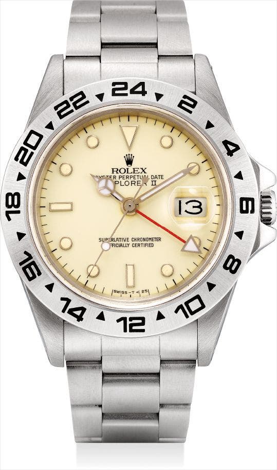 勞力士,非常罕有,不銹鋼鏈帶腕錶,配兩地時間、中心秒針及日曆顯示,“Explorer II”,型號16550,附證書及盒子,1986年製