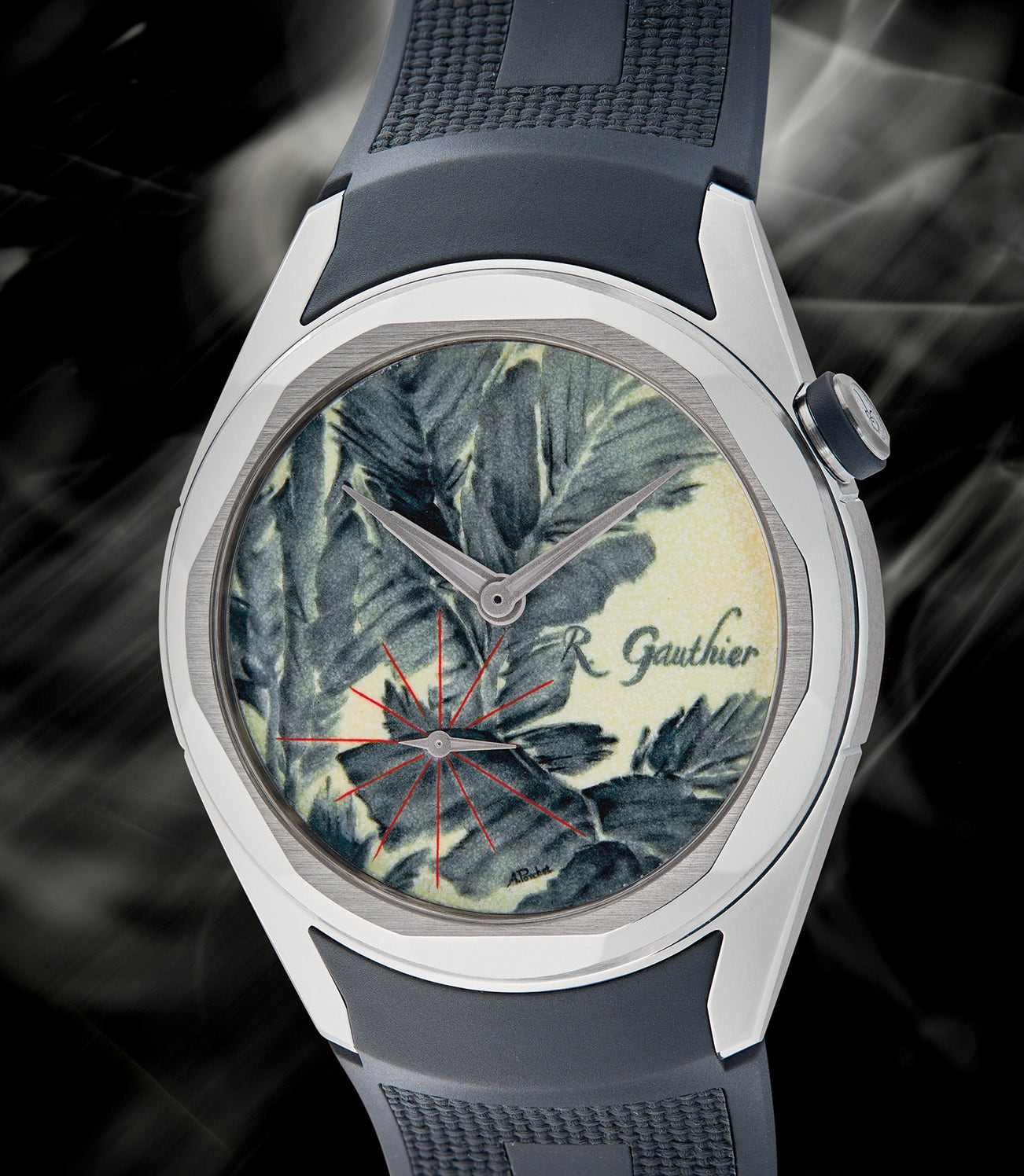 Given full carte-blanche for the very first time, Anita Porchet drew inspiration from Century botanical illustrations and the spiritual reverence found in Chinese ink wash paintings. Maxwell Hearn, head of the Metropolitan Museum of Art’s renowned Department of Asian Art, writes that the aim of Chinese painters is “to capture not only the outer appearance of a subject but its inner essence as well—its energy, life force, spirit.” This ambition is channeled and realized with astounding beauty by Anita Porchet. Rendered in soft black strokes, the subject is rendered in the style of Qu Ding, a Song dynasty master painter. Raw, spontaneous, rich with contrasting light and dark tones contrasted with the bright red lines of the small-seconds dial, the piece is a reflection on the powerful relationship between nature and humanity. Together, this gem-like masterwork captures the divine transcendence that can only be accessed in the natural world.
