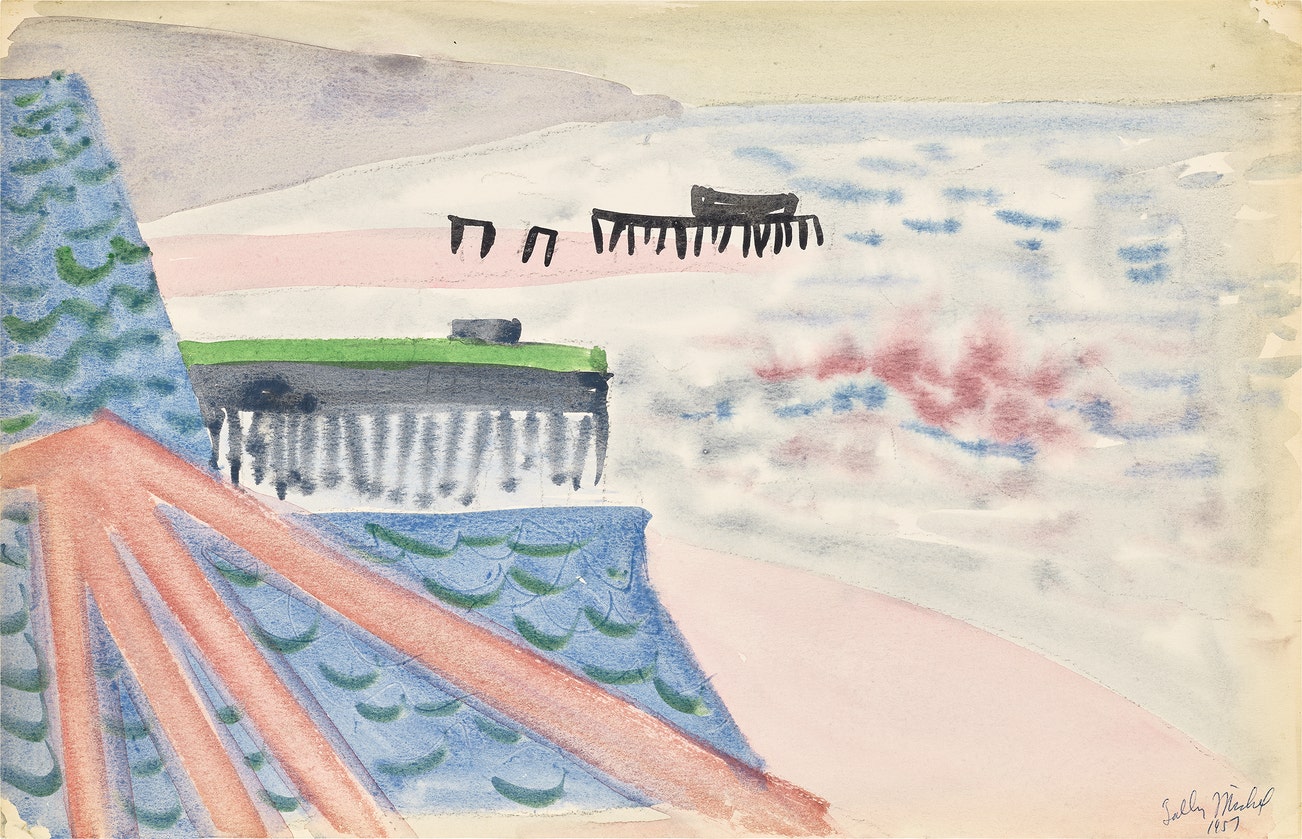 款識:Sally Michel 1957(右下方)"Abandoned Pier" by Sally Michel(畫背)