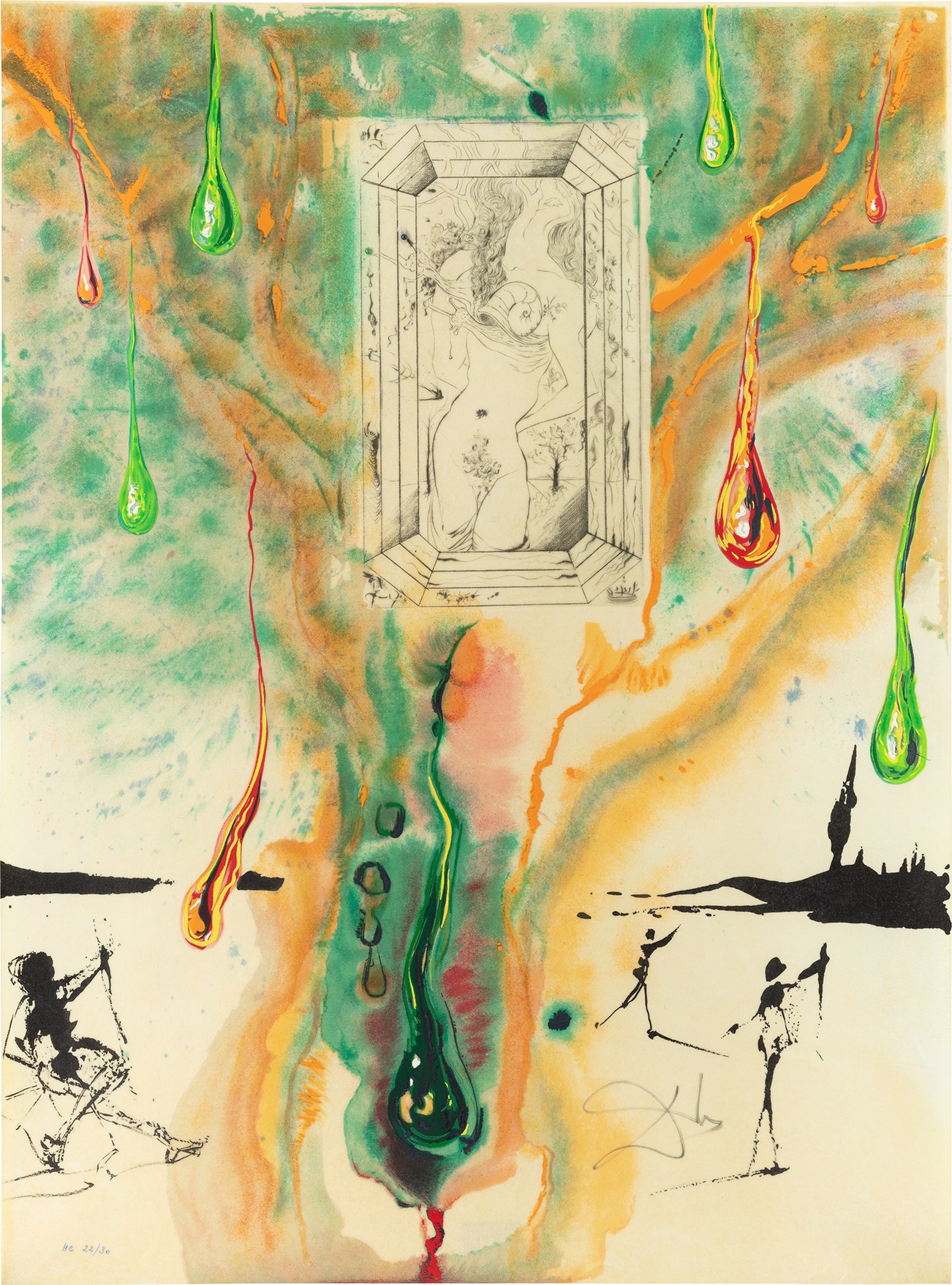 Salvador Dalí was perhaps the most broadly known member of the Surrealist movement of the early twentieth century. Heavily influenced by Sigmund Freud, the avant-garde style explored consciousness and dream-like states through exaggerated landscapes and bizarre or grotesque imagery. Using the means of painting, sculpture, printmaking, film and literature, Dalí explored these ideas with a meticulous hand and inventive wit.