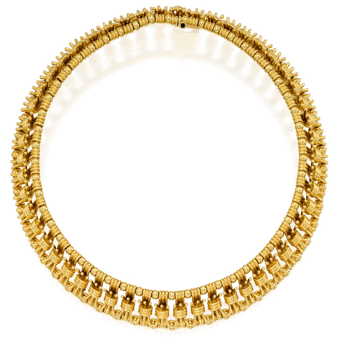 Designed as a series of bowtie links, in 18k yellow gold, inner circumference approximately 14 inches, signed Schlumberger by Tiffany & Co., numbered.