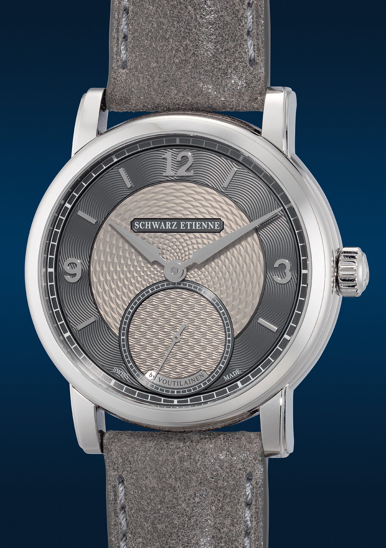 The Schwarz Etienne Roma Synergy by Kari Voutilainen is a collaborative creation between the prestigious Swiss Manufacture, Schwarz Etienne and renowned watchmaker Kari Voutilainen. It boasts a perfectly sized 39mm stainless steel case, a micro-rotor automatic movement, and an exquisitely crafted guilloché dial. Each limited to 50 pieces, it is available in both royal blue and sand grey dial options.