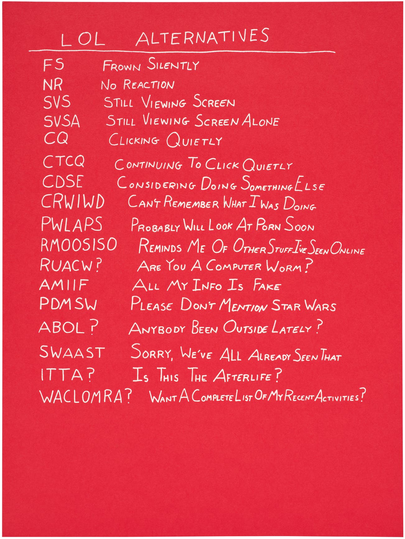 Screenprint in white, on red paper, with full margins.