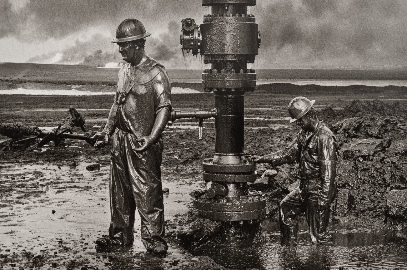 Workers install a new wellhead to enable the injection of a chemical mud to "kill the old well." Greater Burhan, Kuwait