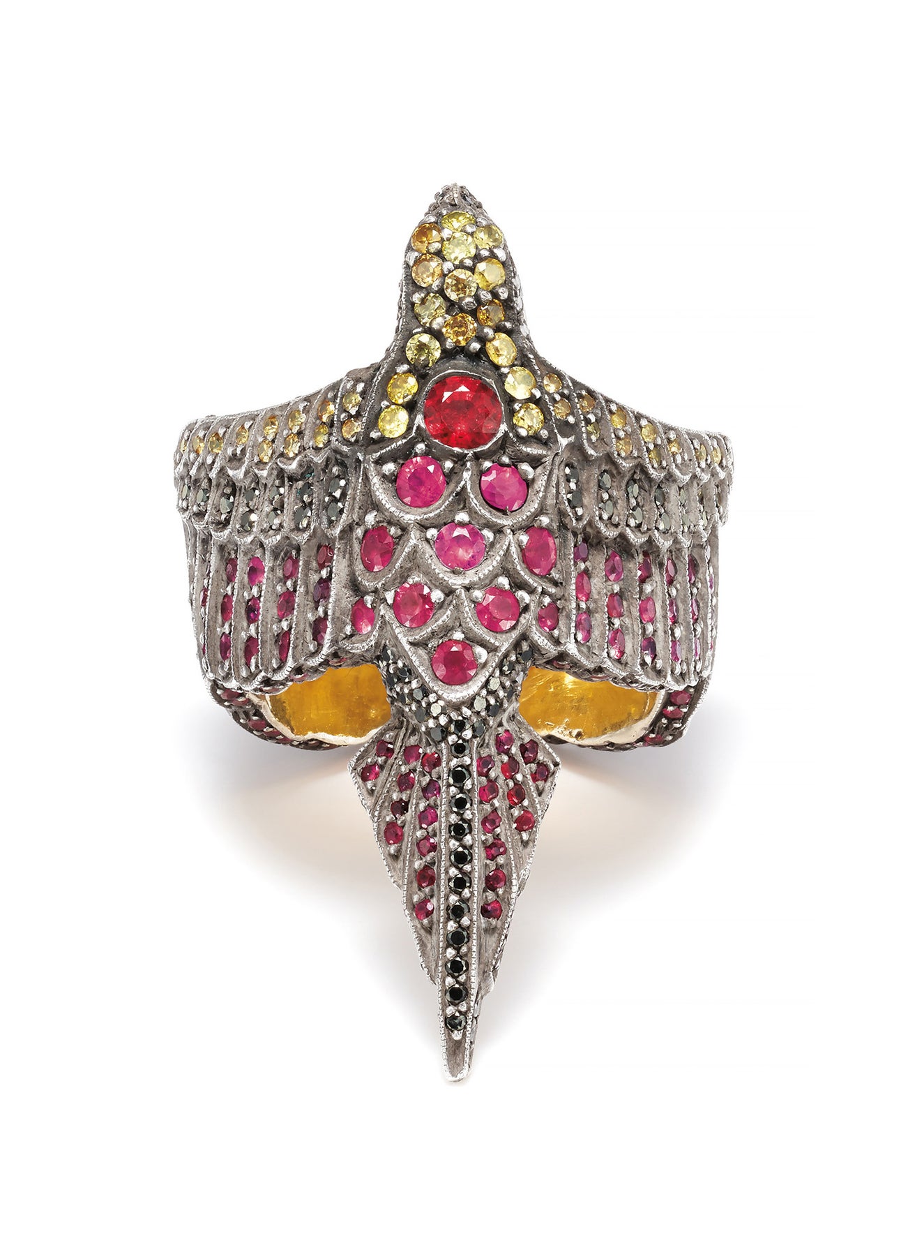 A Colored Diamond, Diamond, Ruby, Gold and Silver Ring