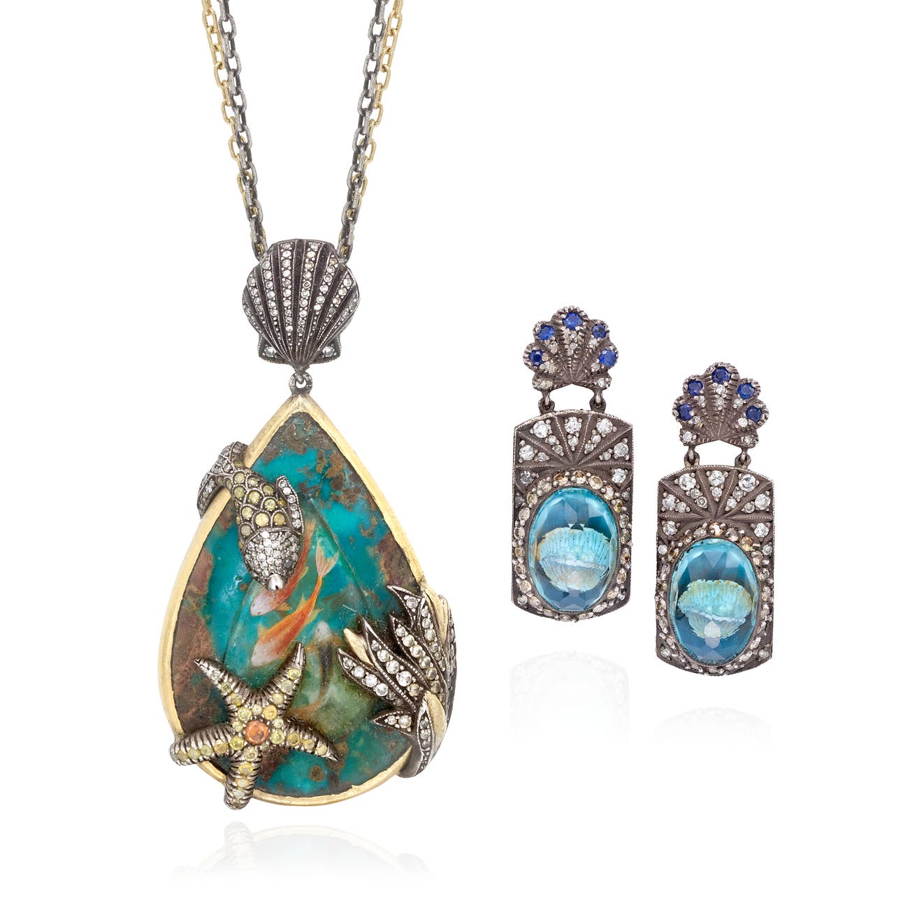 The necklace, of aquatic motif, set with turquoise and hand-painted acrylic, accented by brilliant- and singe-cut diamonds of various tints, mounted in 24k gold and sterling silver, pendant measuring approximately 2 1/4 inches, chain length measuring approximately 20 1/2 inches. The pair of earrings each set topaz engraved using the reverse intaglio technique, accented by brilliant- and single-cut diamonds as well as circular-cut sapphires, mounted in 18k, 10k gold and sterling silver, measuring approximately 1 1/4 inches x 1/2 inch.