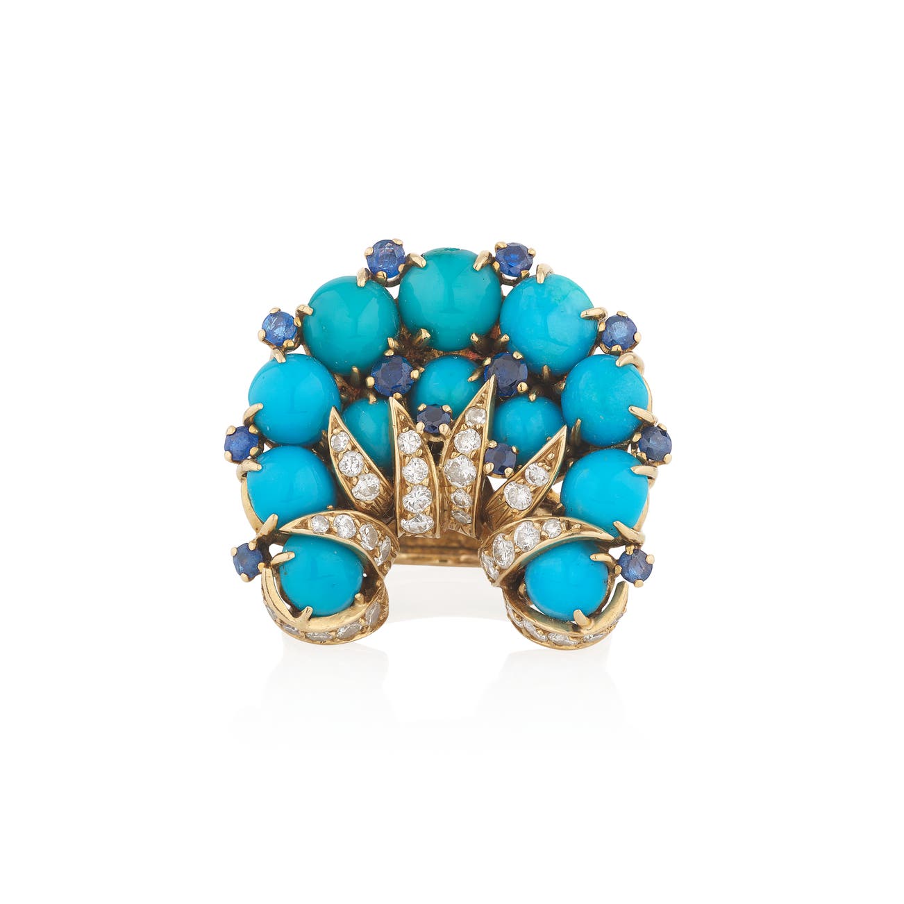 Set with turquoise cabochons, accented with circular-cut sapphires, highlighted with brilliant- and single-cut diamonds, size 49, signed Sterlé, numbered, French assay mark for gold, case stamped Sterlé.