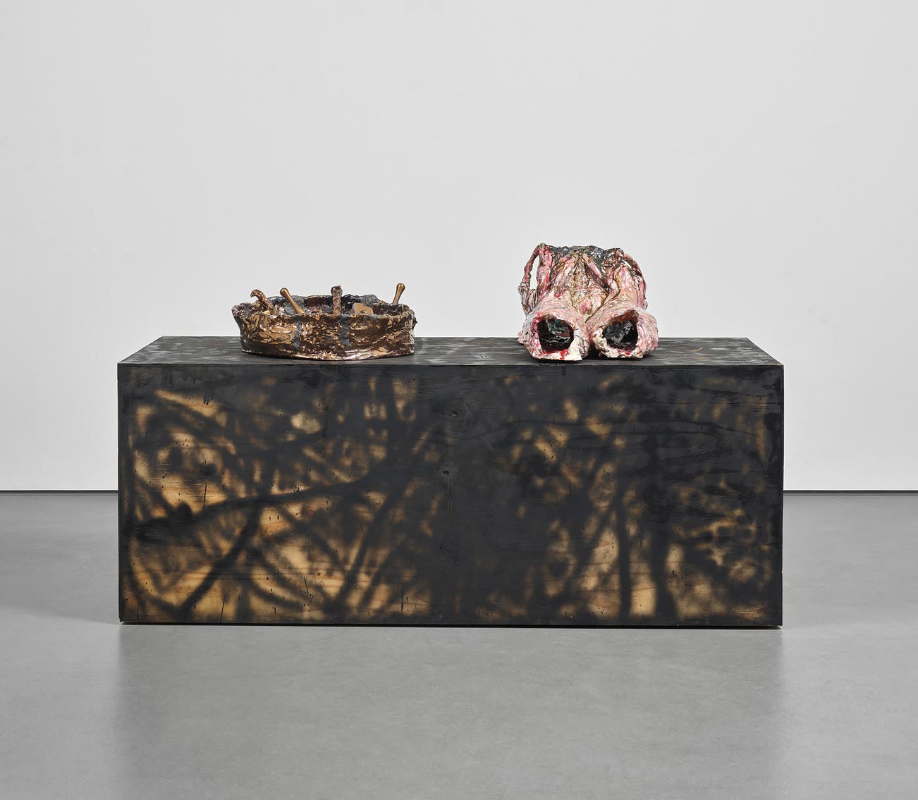glazed ceramic with oxides and brass, in 2 parts on spray painted wooden base