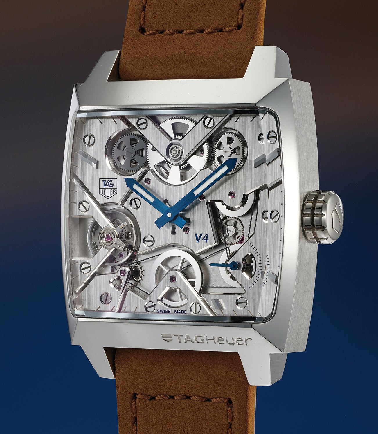 Unveiled as a Concept Watch at BaselWorld 2004, the Monaco V4, is the first watch in the world to feature optimized mechanical transmission belts and a linear winding system with a movement to resemble an engine. A little known fact is that the great independent watchmaker Philippe Dufour participated in the creation of the original prototype.