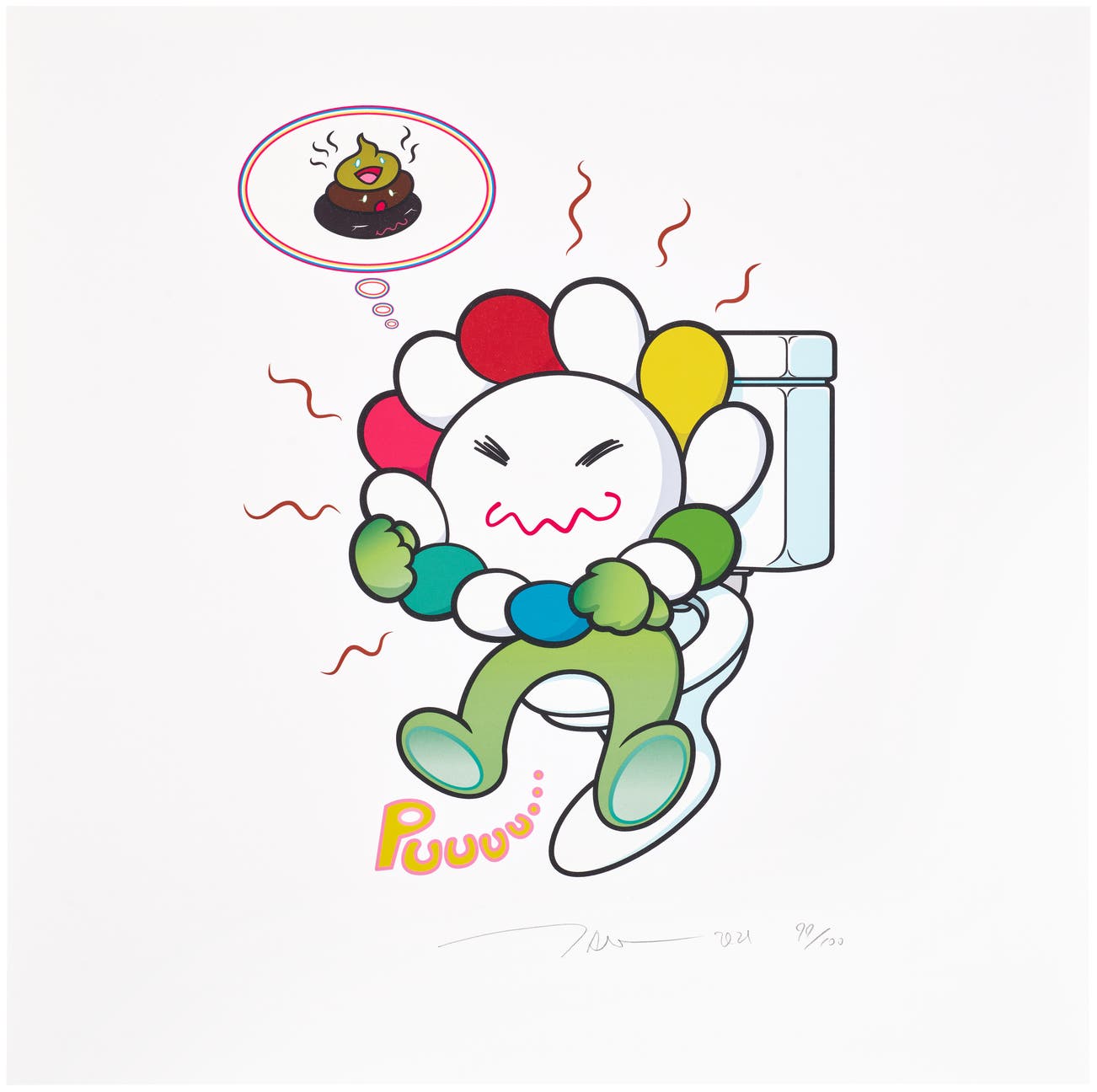 In the 1990s, Murakami founded the Superflat movement in an attempt to expose the "shallow emptiness of Japanese consumer culture." The artist plays on the familiar aesthetic of mangas, Japanese-language comics, to render works that appear democratic and accessible, all the while denouncing the universality and unspecificity of consumer goods. True to form, Murakami has done collaborations with numerous brands and celebrities including Kanye West, Louis Vuitton, Pharrell Williams and Google.