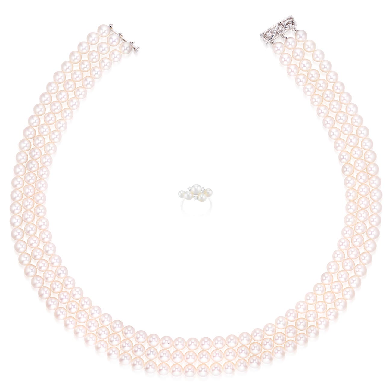 The necklace composed of three rows of cultured pearls measuring approximately 7.43 to 7.03 mm, completed by a clasp decorated with brilliant-cut diamonds, with maker's mark for Tasaki, length approximately 450 mm, case stamped Tasaki; and a ring, set with five cultured pearls measuring approximately 5.77 to 4.24 mm, highlighted with brilliant-cut diamonds, signed Tasaki, size 5½, case stamped Tasaki.
