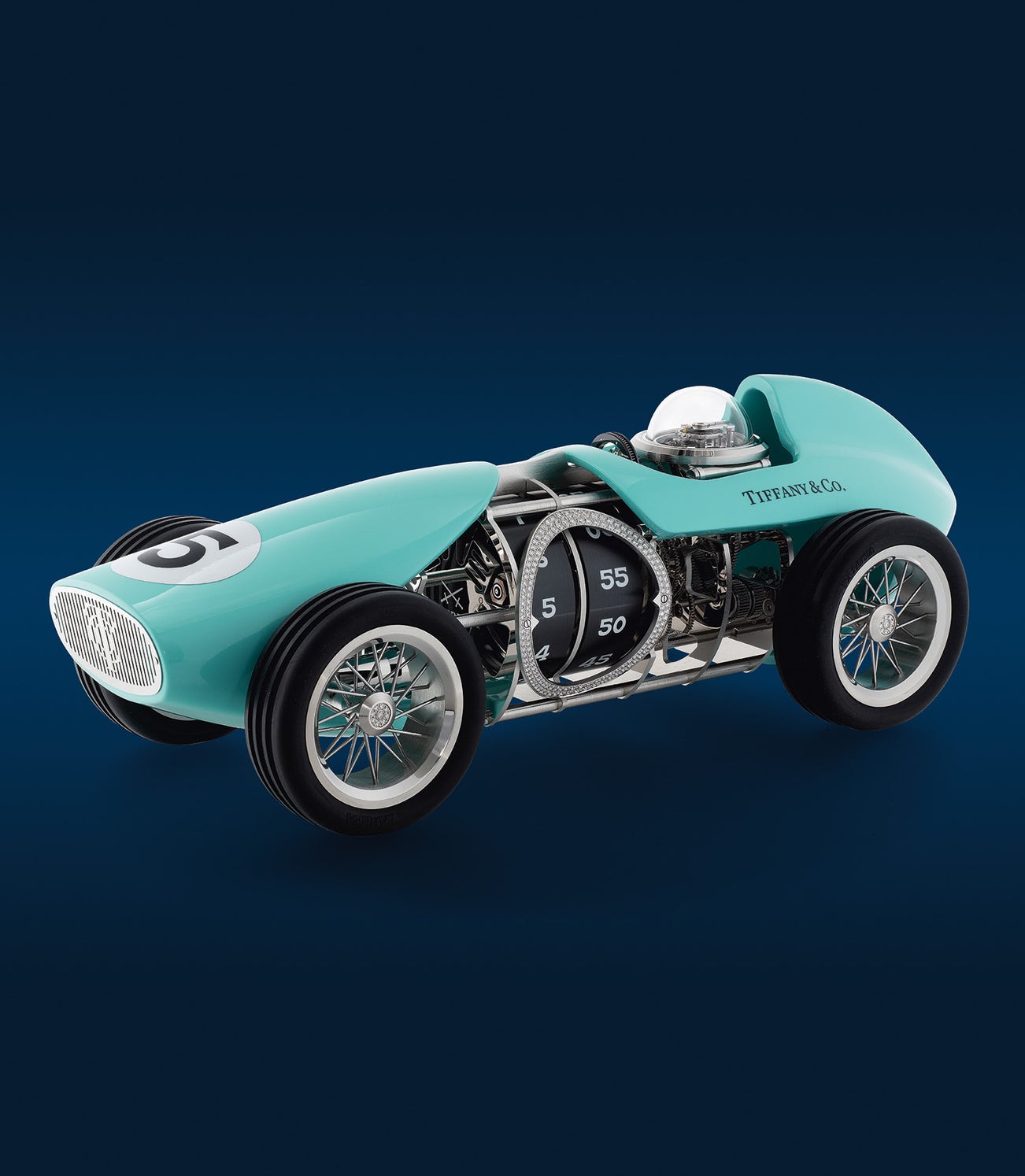 This limited edition clock made exclusively for the Japanese market dazzles with 192 brilliant-cut diamonds, including eye-catching 1-carat stones at each wheel's center. Pavé diamonds embellish the bezel in glittering contrast to the smooth Tiffany Blue metal body. Details such as the "T&CO" grille and its flagship Fifth Avenue store inspired "5" bumper provide tasteful hints of Tiffany &Co. 's storied history. The clockwork revs to life under a helmet-domed glass, offering a glimpse of the L’Epée in-house cal. 1855 MHD mechanics in motion.