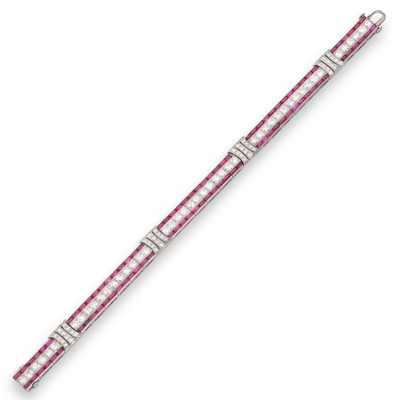 Of geometric design, set with calibré-cut rubies and circular-cut diamonds, length approximately 180mm, signed Tiffany & Co.