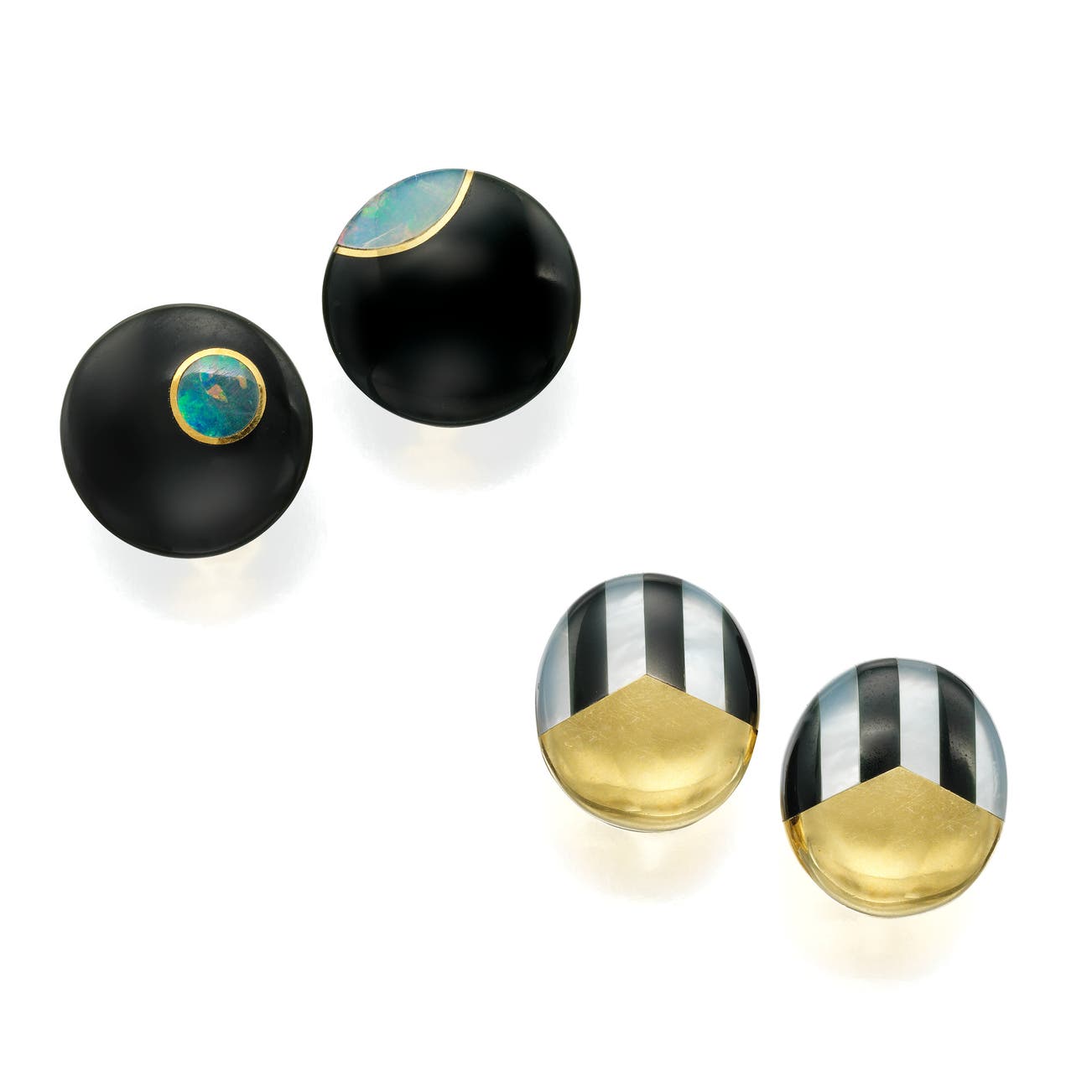 A pair of earrings with black jade discs inlaid with circular opal, in 18k yellow gold, measuring approximately 5/8 inches, signed Tiffany & Co., and a pair of earrings inlaid with alternating black jade and mother of pearl, in 18k yellow gold, measuring approximately 5/8 inches, signed Tiffany & Co.