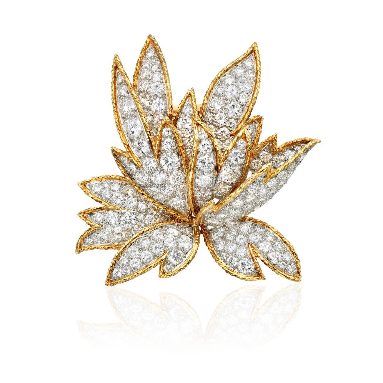 Of foliate design, set with brilliant-cut diamonds, mounted in 18k yellow and white gold, measuring approximately 2 3/8 x 2 1/4 inches, signed Tiffany & Co.