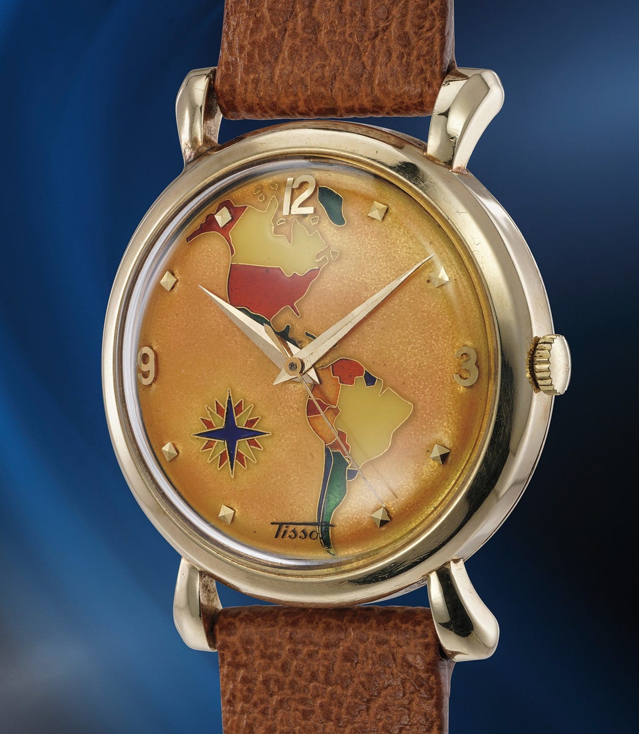 The present “2 Americas” design is a rare twist on the geographical maps theme, a classic of cloisonné enameling. While North and South America designs are relatively (for enamel dials) common, this design N°14 from Marguerite Koch with the 2 continents has been seen only three other times: on a Vacheron Constantin timepiece and 2 Tissot wristwatches including this one. Intriguingly, in depth analysis of the Stern books reveal no other similar dial, thus it is highly probable that these 3 pieces are the only ones ever executed with this extraordinary design. A similar design (No. 20, featuring a black sea) is known from a Rolex timepiece.