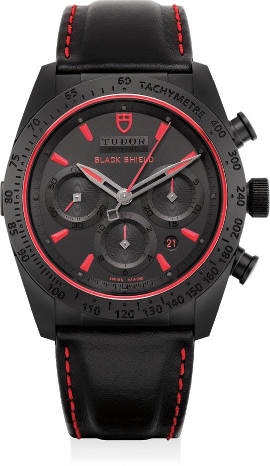 帝舵,「Fastrider Black Shield」型號42000CR,PVD鍍層陶瓷錶圈自動上弦腕錶,配計時功能和日期顯示,約2016年製。附錶盒和保證卡