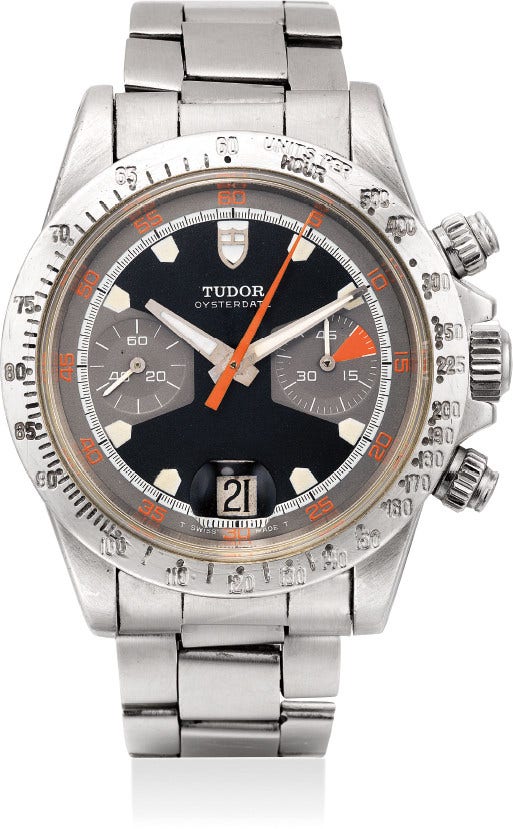 帝舵,「Monte Carlo Black Home Plate」型號7032/0,非常罕有,精鋼鏈帶腕錶,配計時功能及黑色啞光面錶盤,約1971年製。附帝舵保修錶盒和配件