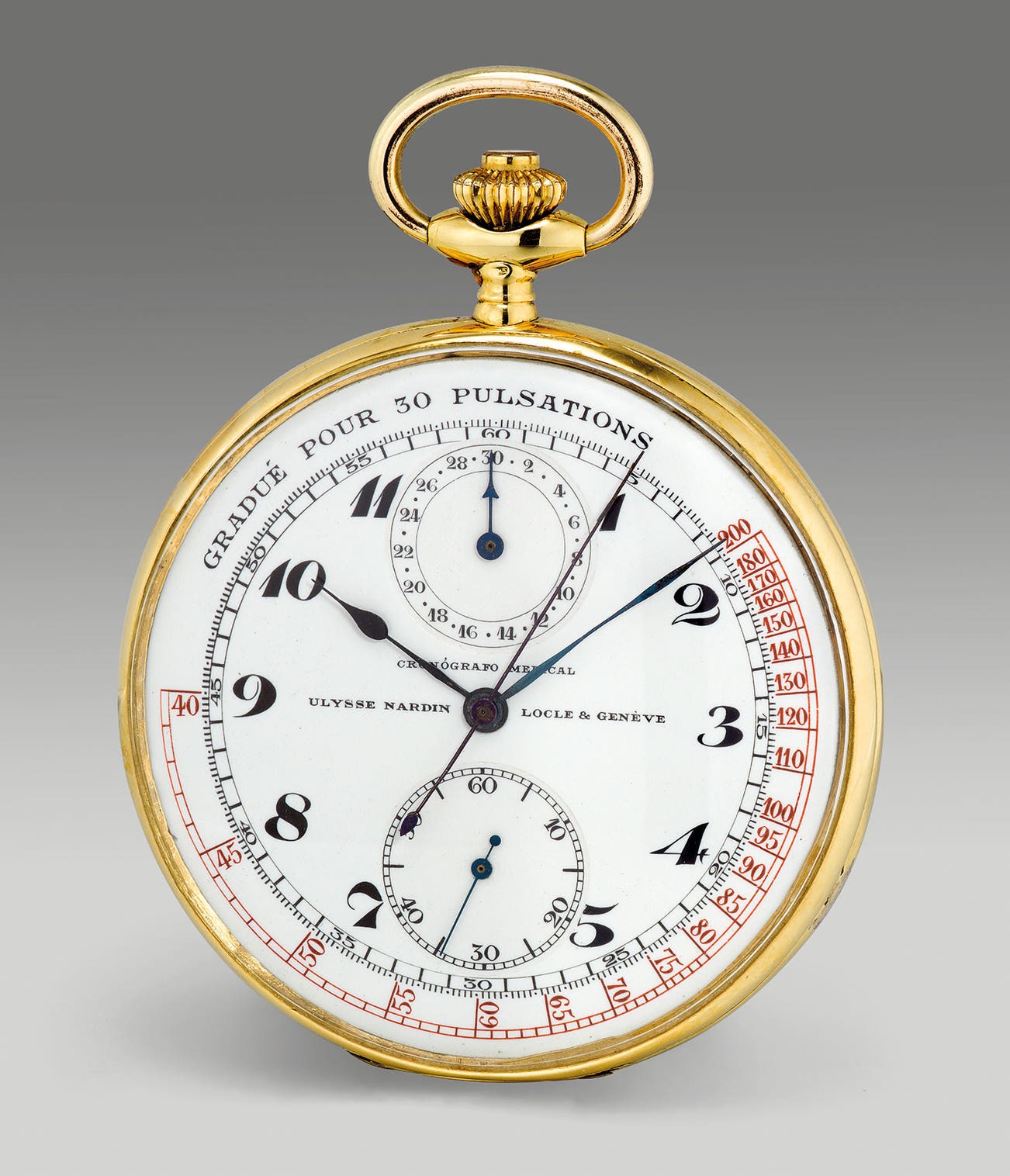 The present Ulysse Nardin medical chronograph is a lovely early 20th century example with a pulsation dial marked in red, and its original intended use, marked directly below the 30 minute register, “cronógrafo medical.” The watch is in lovely condition with a clean dial free featuring Breguet numerals from defects, and strong hallmarks on the case. Pocket watches are often seen as an instrument of the past, however it is this past that created the modern, and we see contemporary watch makers looking to horology’s history for inspiration.