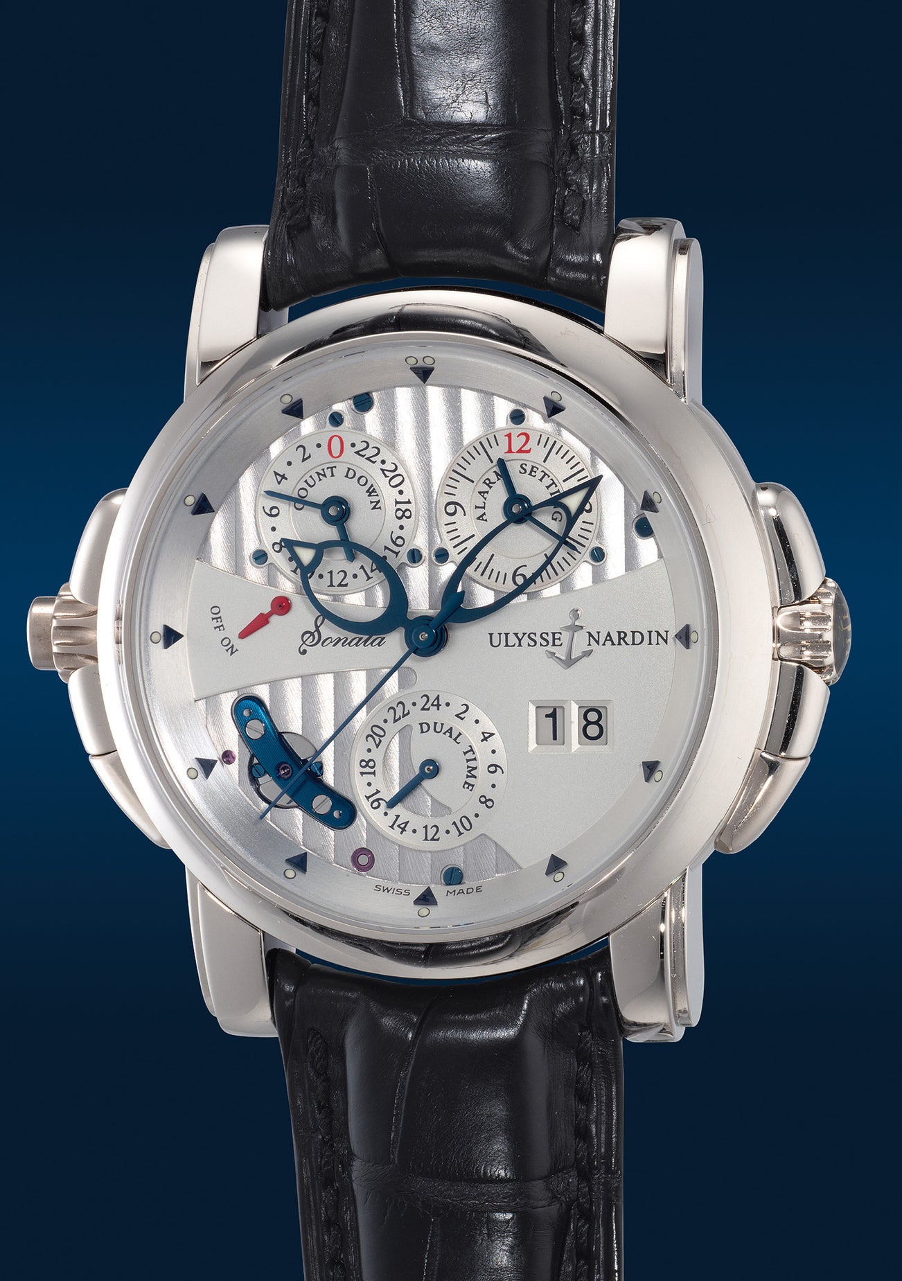 While most alarm watches emit a buzzing sound upon activation, this particular timepiece is equipped with a cathedral gong, surpassing the quality of a typical minute repeater commonly found in the market. The cathedral gong encircles the movement twice, producing a rich and crisp sound, showcasing the ingenious craftsmanship of Ulysse Nardin. Encased in 18K white gold, this watch also incorporates a dual time function and a large date display, making it an unconventional yet highly practical masterpiece.