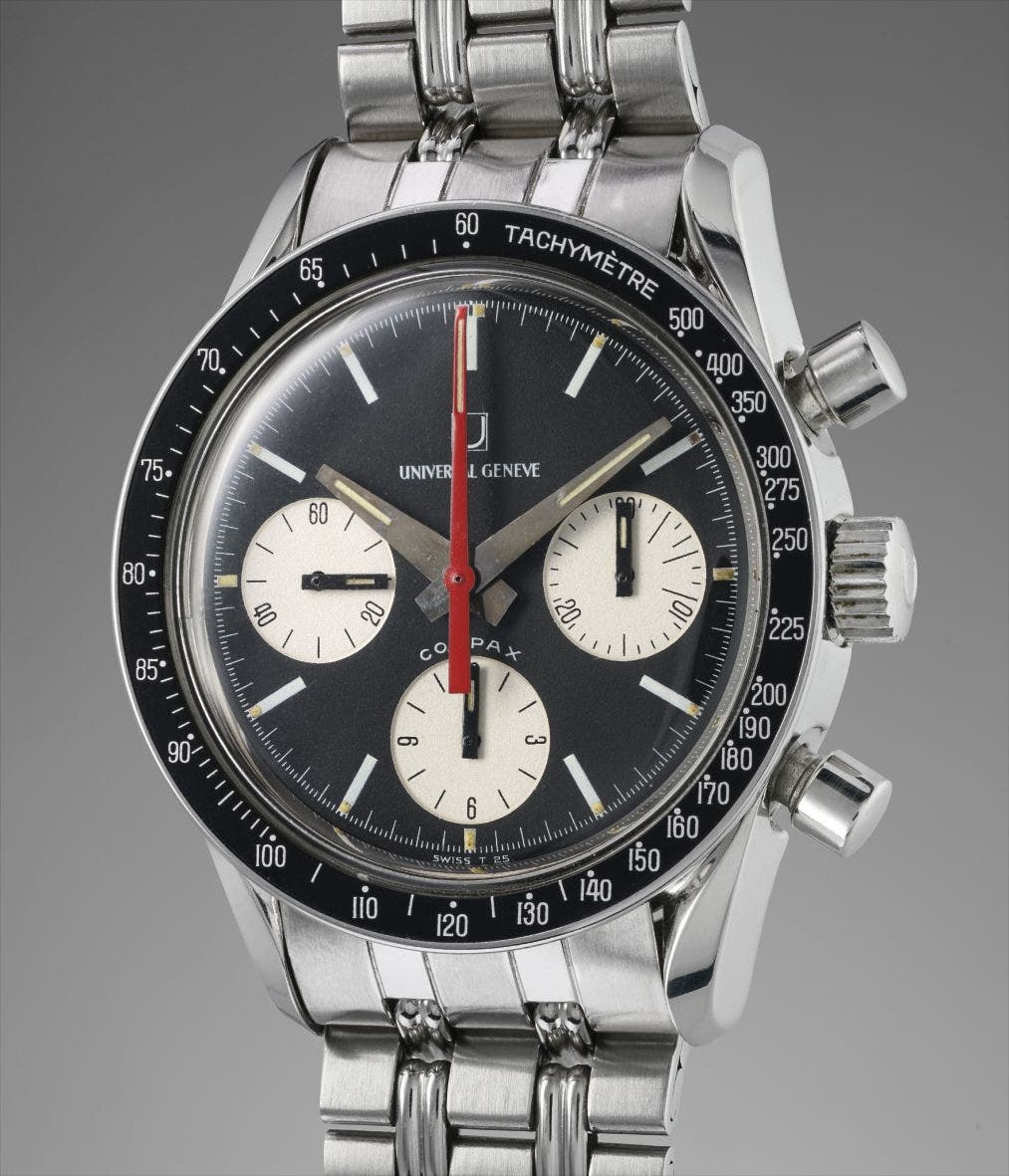 The present watch, fitted with a black dial and white registers, is nicknamed "Evil Nina" due to its color scheme. It is the thematic opposite of the "Nina Rindt", which has a white dial and black registers. Nina Rindt often donned a Universal Compax with white dial and black registers to sporting events.