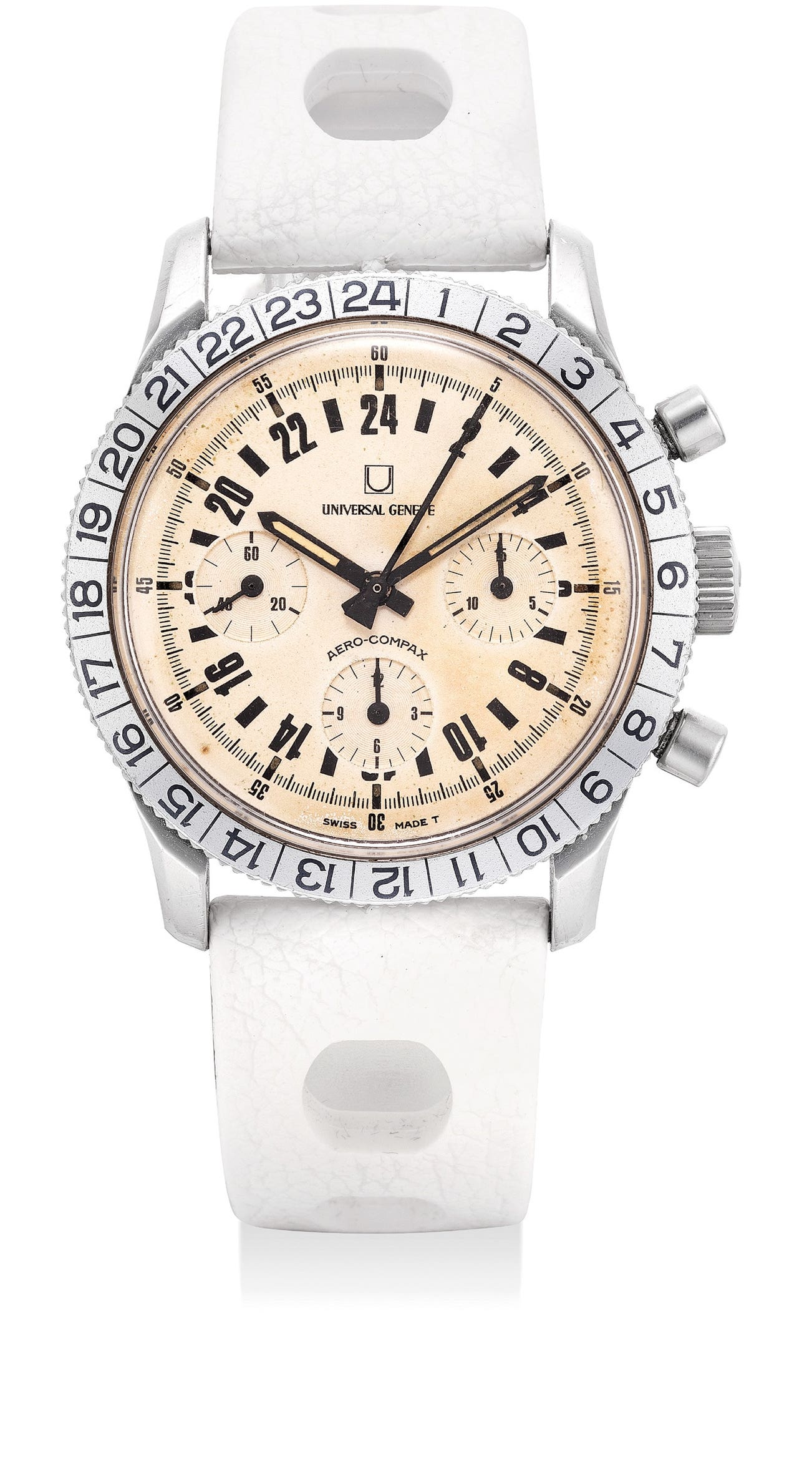 宇宙,「Aero-Compax」型號890101/01,十分罕有,精鋼腕錶,配計時功能和24小時顯示,約1967年製。附錶盒