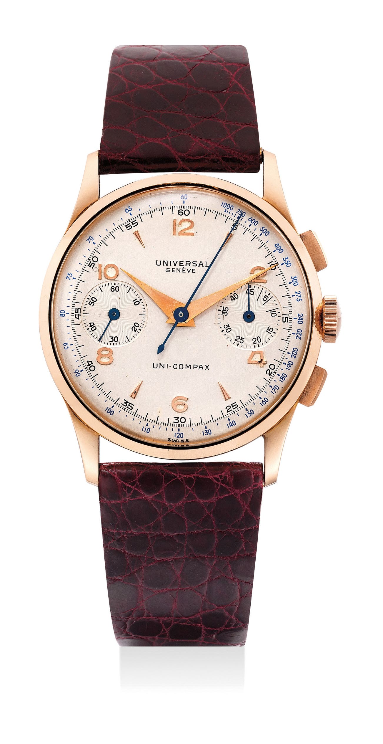 宇宙,「Uni-Compax」型號12445,18K玫瑰金計時腕錶,約1950年製。附錶盒
