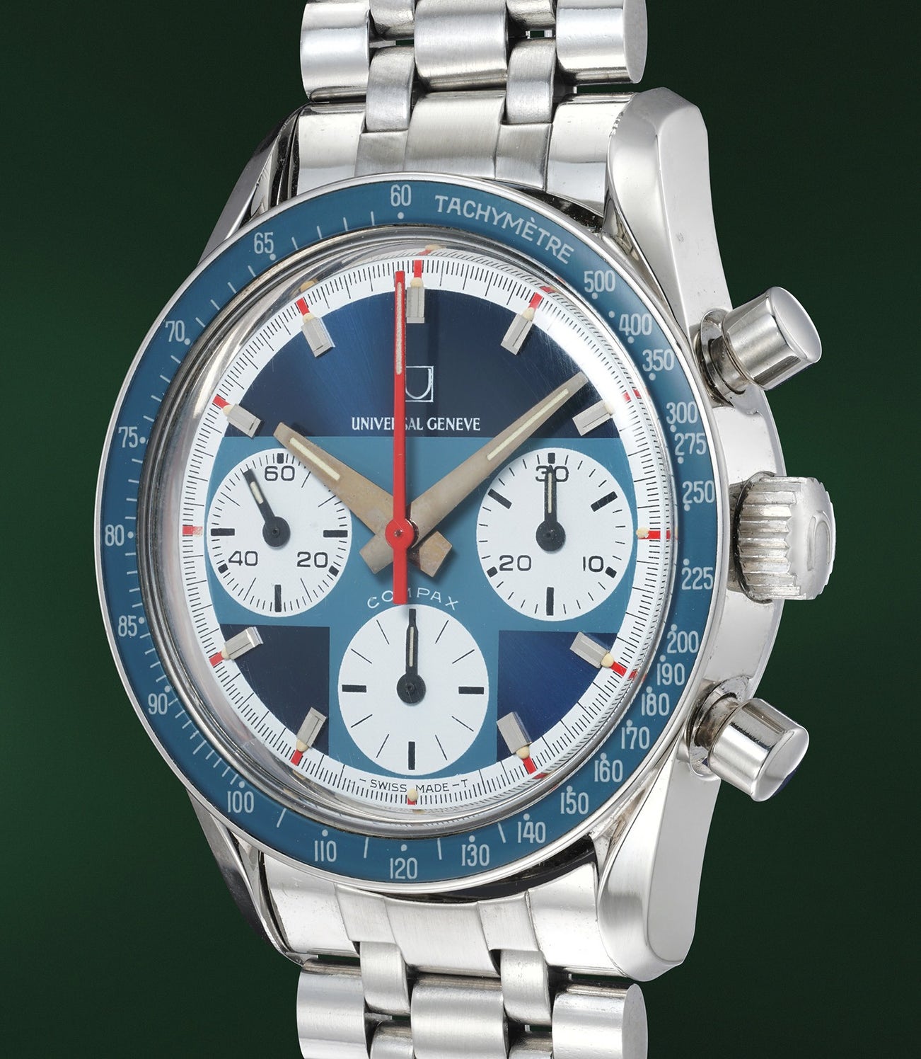 The history of Universal Genève mirrors the history of the chronograph wristwatch. Founded in 1894 in Le Locle as Universal Watch, the brand initially began as a workshop assembling watch parts. However, by the early 20th-century the founders patented their first 24-hour timepiece. During World War I, they manufactured pocket watches and wristwatches for both sides of the war effort. In 1936, Universal Genève released their first Aero Compax model and it is from this beginning that collectors today appreciate their timepieces, with names such as Uni-Compax, Tri-Compax, and the famed Polerouter designed by Gerald Genta. Today, Universal’s chronograph wristwatches are highly sought after both for their modern mid-20th century aesthetic, fascinating dial variations, and superb quality.