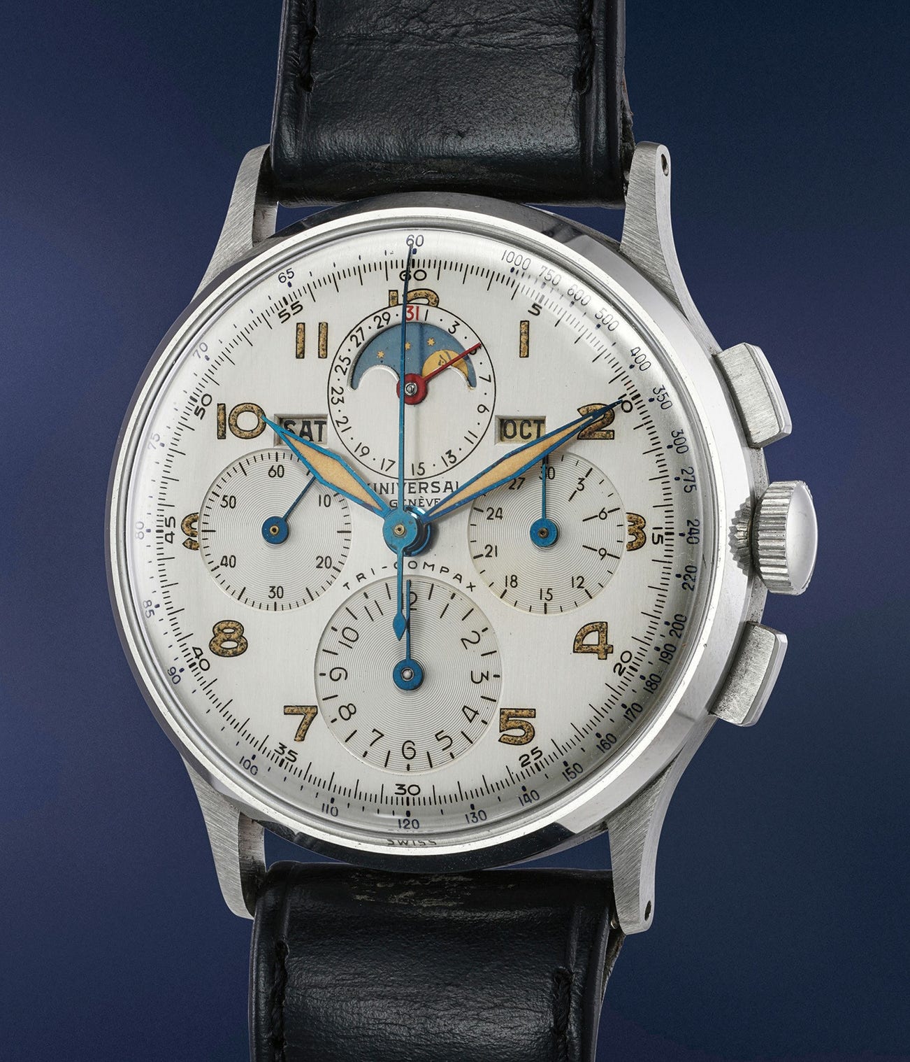 The present Tri-Compax is distinguished by its impressive and virtually "new old stock" condition. The dial barely shows any sign of aging, and the case remains as crisp as it was the day it left the factory. Such gems hardly appear on the market, no less is such untouched and original condition. As an added detail, it is even accompanied by its original vintage strap.