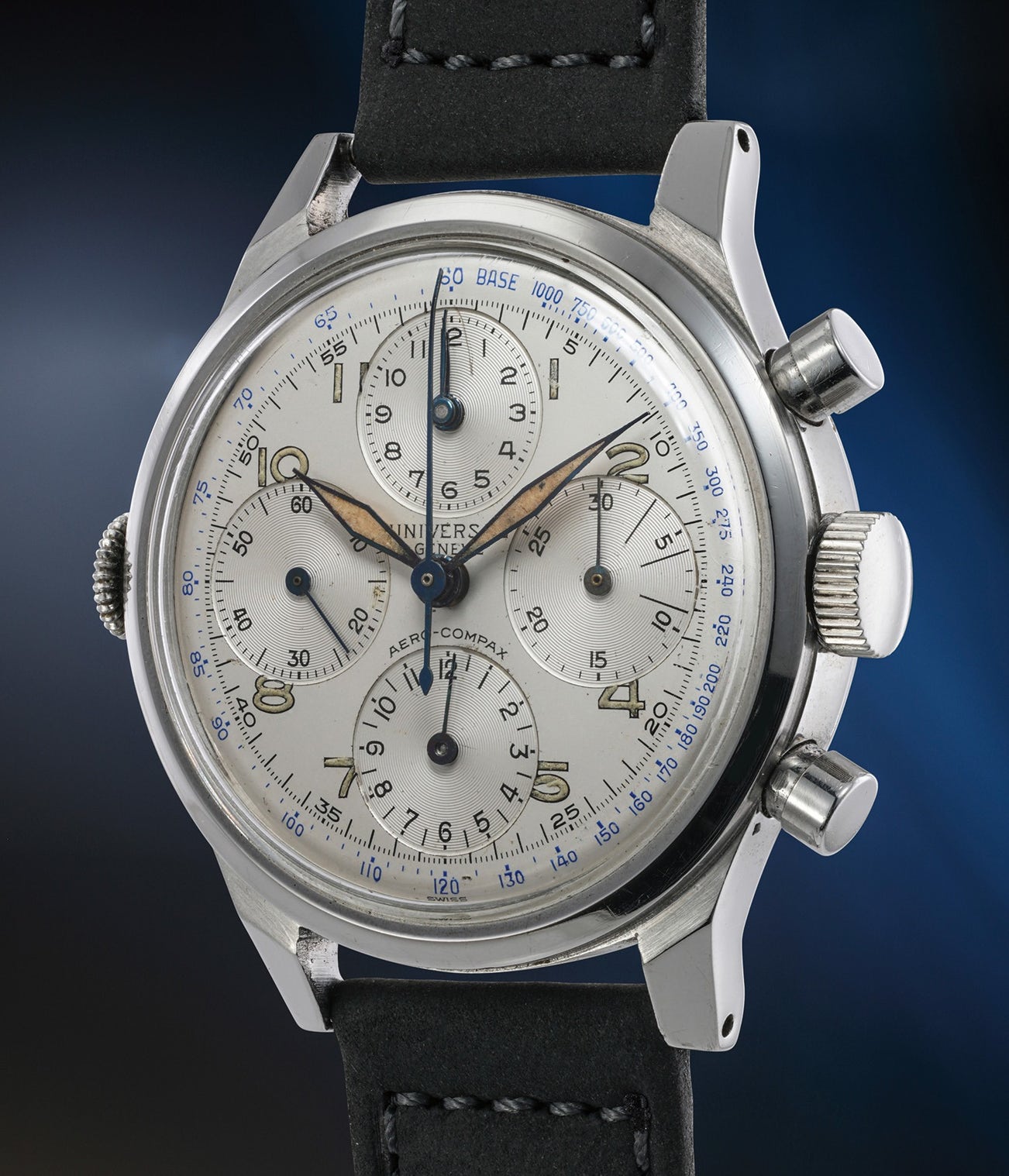 The history of Universal Genève mirrors that of the history of the chronograph wristwatch. Founded in 1894 in Le Locle as Universal Watch, the brand initially began as a workshop assembling watch parts. However, by the early 20th-century the founders patented their first 24-hour timepiece. During World War I, they manufactured pocket watches and wristwatches for both sides of the war effort. In 1936, Universal Genève released their first Aero Compax model and it is from this beginning that collectors today appreciate their timepieces, with names such as Uni-Compax, Tri-Compax, and the famed Polerouter designed by Gerald Genta. Today, Universal’s chronograph wristwatches are highly sought after both for their modern mid-20th century aesthetic, fascinating dial variations, and superb quality.