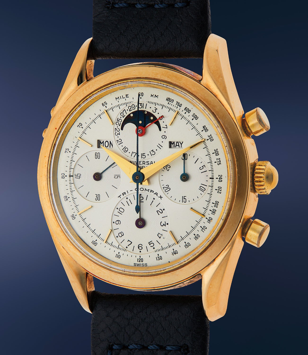 Universal’s Tri-Compax wristwatch was released in 1944 as a celebration of the firm’s fiftieth anniversary, and a successor to their iconic “Compax” watches first introduced in 1935. The Tri-Compax name referred to the three featured complications; chronograph, calendar and moonphase, and production continued until the 1960s. Today, vintage wristwatches by Universal are highly sought after for their modern mid-century aesthetics and superb quality, with offerings such as the Uni-Compax, the famed Polerouter designed by a young Gerald Genta, and the present model, the Tri-Compax chronograph.