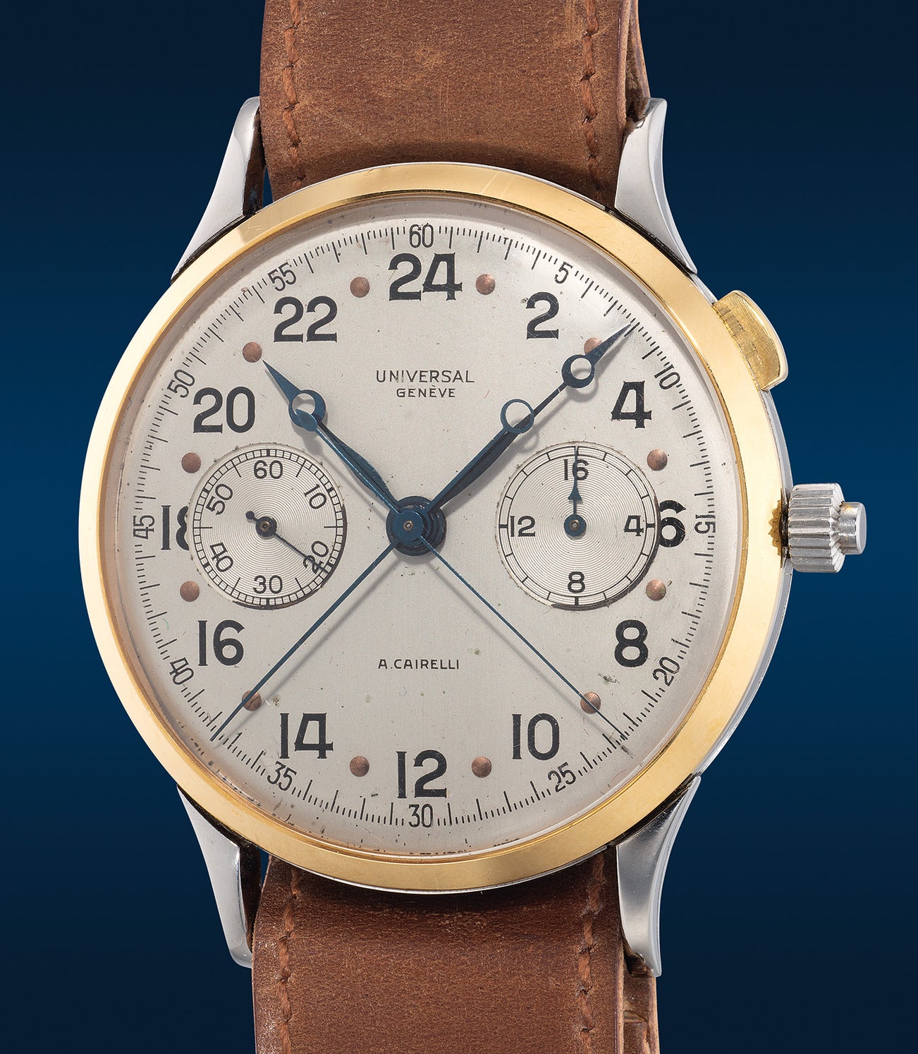 The present Universal split-seconds timepiece is an uncommon model created for the Italian Ministry of Defence and the Italian Air Force and it was distributed through the renowned retailer A. Cairelli of Rome and served as a navigation tool during a time when flight crews relied on dead reckoning and beacons for orientation. Universal opted for a 24-hour dial design with a 16-minute subsidiary register, which, thanks to the large 44.5mm case diameter, ensures legibility and ease of reading during nocturnal missions. The retailer's signature is prominently displayed at the 6 o'clock position, a feature found in many collectible military timepieces of the 20th century. Powered by the Valjoux 55 caliber, the same movement used in the famed Rolex reference 4113, this watch exemplifies precision timekeeping and functionality.
