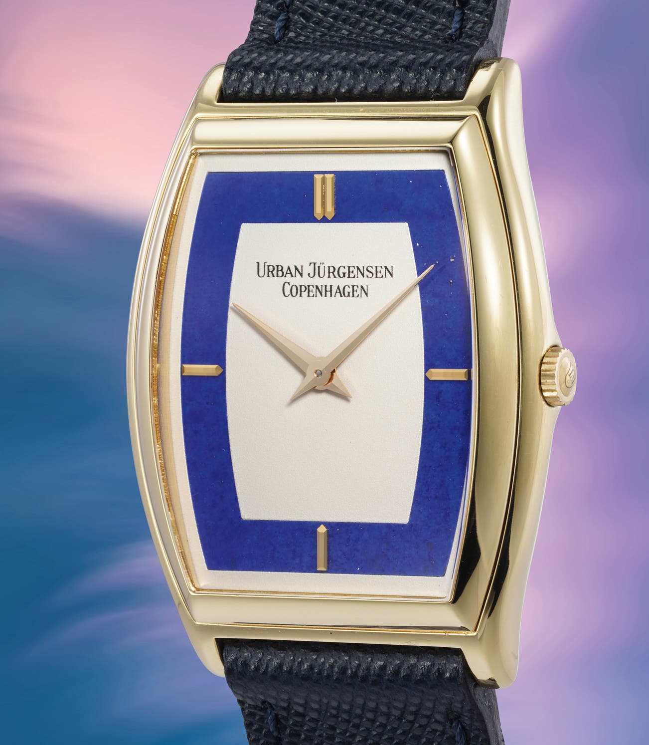 The reference 6 first appeared on the market in the mid-1990s and remained in the catalogues until at least 2003. With a manual winding Frédéric Piguet calibre movement, the reference 6 is the only Urban Jürgensen model from this period that does not have an automatic movement. The tonneau case is a distinct departure from the teardrop lugs of other references, such as the 1, 2, 3, 4 and 5. Instead of the usually found Observatory-style hands, the present example has sword-shaped ones. Finally, the lapis lazuli dial is unlike anything ever made by the brand during this period. While we do not know the origins of the design, one can say definitively that it showcases and represents the brand's willingness to pivot and daringly challenge its own status quo, underscoring the significance of this watch.