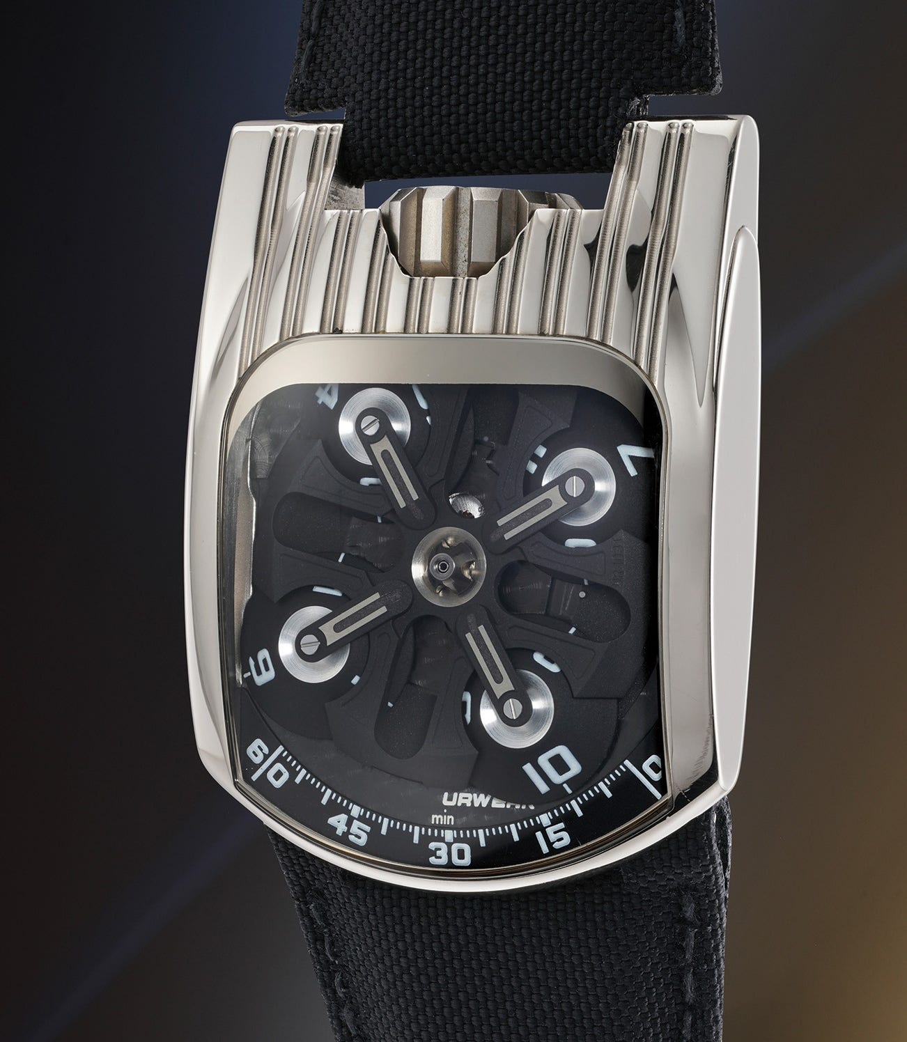 Incredibly innovative, the present watch is cased in white gold and speaks to the ingenuity and daring nature of Urwerk and their designs.
