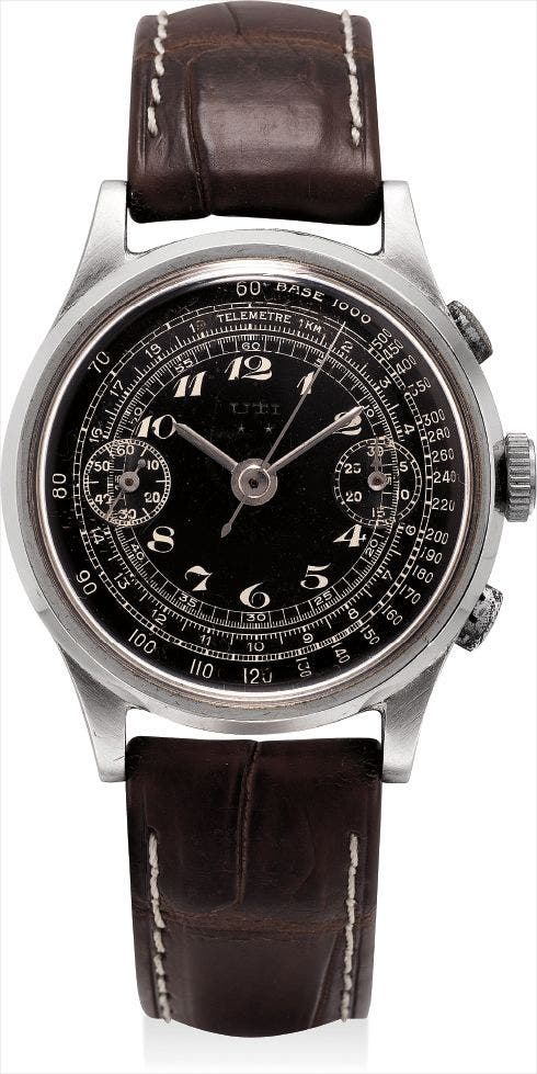 Uti,罕有,不銹鋼腕錶,配計時功能、黑色錶盤及寶璣數字,約1945年製